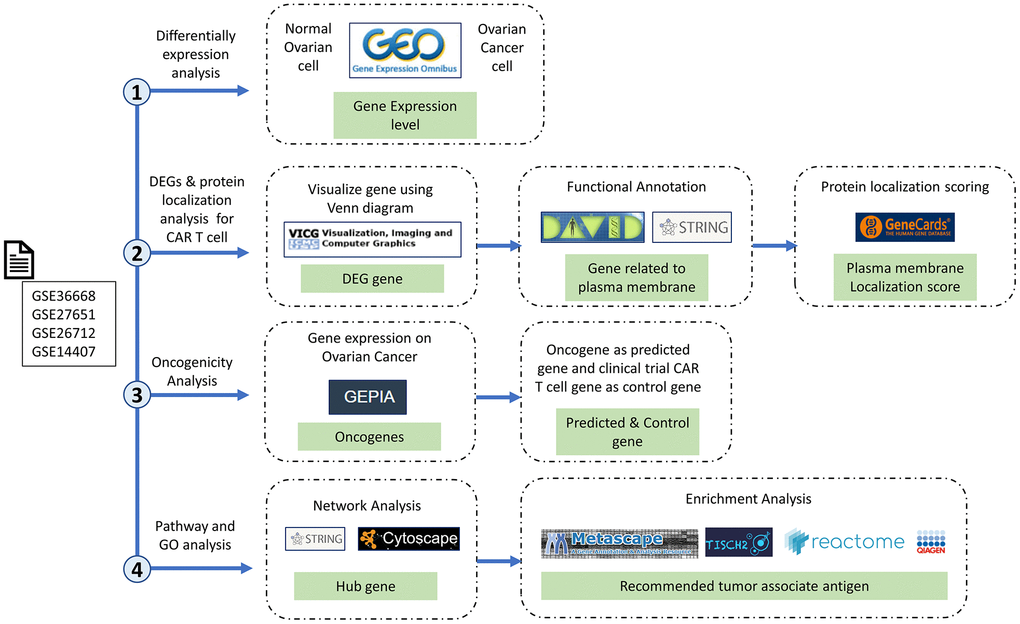The potential deployment of CAR-T-cell therapies in OC is increasingly recognized; however, our understanding of suitable antigenic targets remains in its infancy. Addressing this knowledge gap will significantly propel the development of more effective, personalized CAR-T-cell therapies for OC. In this era of precision medicine, the utility of bioinformatics cannot be overstated. Bioinformatics, the application of computational tools to manage, analyze, and interpret biological data, has become a mainstay in cancer research, particularly in the era of high-throughput genomics. Integrating genomic, transcriptomic, and proteomic data from various sources can provide a comprehensive landscape of tumor biology, facilitating the discovery of potential targets for novel therapeutics [8]. In this study, we aimed to leverage the power of bioinformatics to uncover potential targets for CAR-T-cell therapy in the context of OC. By interrogating genomic, transcriptomic, and proteomic datasets, we sought to identify preferentially and highly expressed antigens in ovarian tumor tissues. The bioinformatics strategy we employed offers an accelerated, systematic, and unbiased approach to antigen discovery. We hypothesized that such a comprehensive analysis could propel significant advancements in CAR-T-cell-based immunotherapeutic interventions for OC.