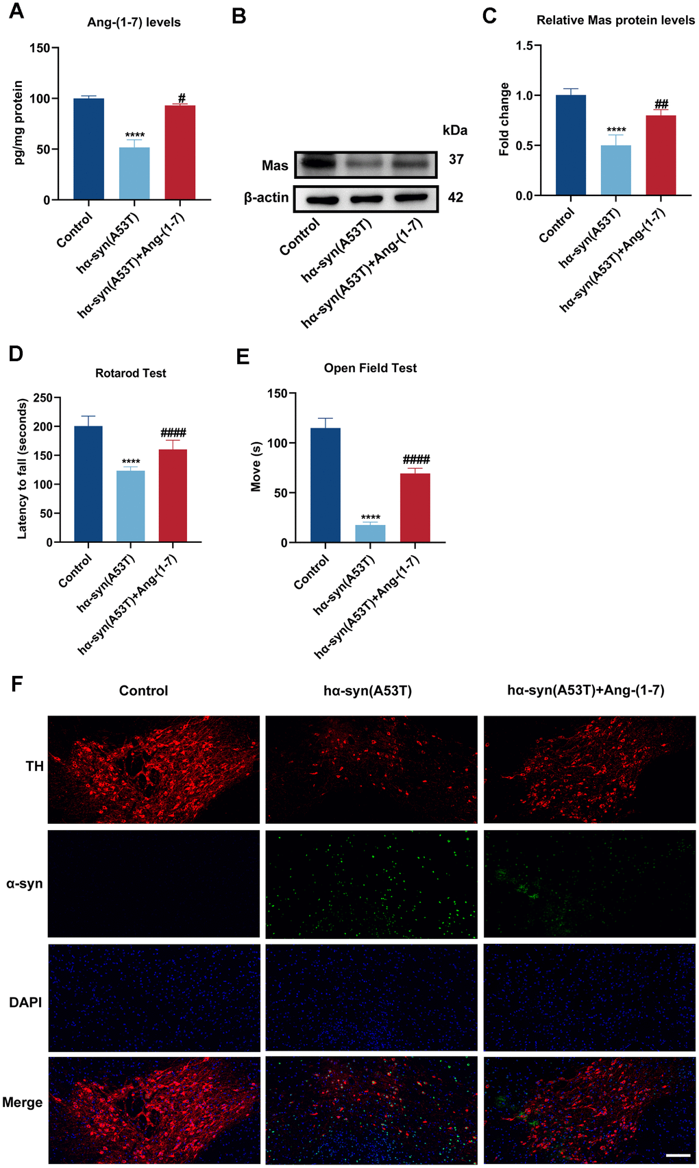 Mice were randomly arranged for three groups: Control group and hα-syn(A53T) group received supranigral injection of artificial cerebrospinal fluid (aCSF) (0.25 μL/hour) for 4 weeks, hα-syn(A53T) + Ang-(1-7) group received supranigral injection of Ang-(1-7) (1.1 nmol/0.25μL/hour, Sigma-Aldrich, St. Louis, MO, USA) for 4 weeks. The procedure and dosage for this experiment is following our previous study [39].