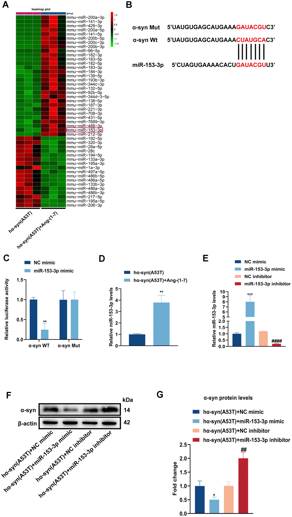 To identify whether miRNAs were involved in Ang-(1-7) induced neuroprotective effect in PD, we conducted high-throughput miRNA sequencing in the hα-syn(A53T) mice with or without Ang-(1-7) administration. As shown in Figure 2A, 46 differentially expressed miRNAs were chosen with |log2(fold change) |≥1 and P