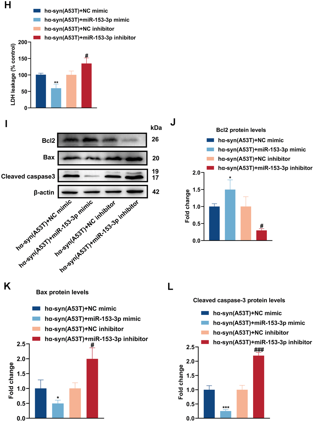 (H) Cell cytotoxicity of primary dopaminergic neurons in each group was tested by LDH assay (n = 3). (I) The levels of Bcl2, Bax and cleaved caspase-3 in every group were observed by Western blot (n = 3). (J) Quantitative evaluation of Bcl2 level. (K) Quantitative evaluation of Bax level. (L) Quantitative evaluation of Cleaved caspase-3 level. Data are shown as the mean ± SD. *P<0.05 versus the hα-syn(A53T) + NC mimic group; **P<0.01 versus the NC mimic, hα-syn(A53T) or hα-syn(A53T) + NC mimic group; ***P<0.001 versus the NC mimic or hα-syn(A53T) + NC mimic group; #P<0.05, ##P<0.01 and ###P<0.001 versus the hα-syn(A53T) + NC inhibitor group. ####P<0.0001 versus the NC inhibitor group.
