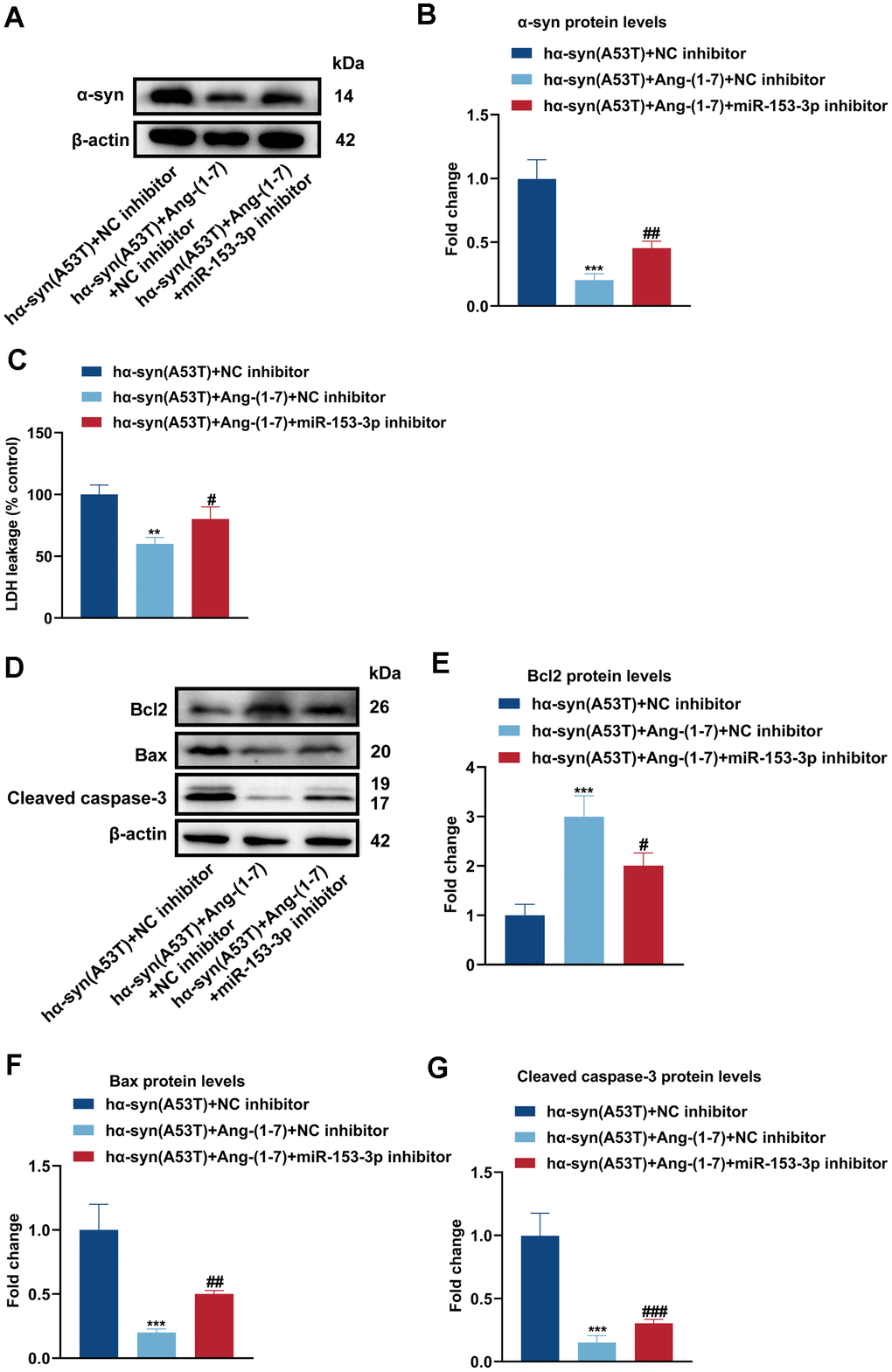 To observe whether Ang-(1-7) reduces the level of α-syn and apoptosis via miR-153-3p, Ang-(1-7), miR-153-3p inhibitor or its negative control was added to hα-syn(A53T) overexpressed dopaminergic neurons. As revealed in Figure 3A, 3B, co-treatment with Ang-(1-7) obviously inhibited the α-syn expression compared with the group treated with NC inhibitor alone. However, this variation was reversed by miR-153-3p inhibitor. Meanwhile, the LDH leakage showed the same variational tendency in all groups with that of α-syn (Figure 3C). At last, as indicated by Figure 3D–3G, Ang-(1-7) apparently enhanced the level of Bcl2 whereas reduced the level of Bax and cleaved caspase-3 compared with the NC inhibitor transfected group. However, transfection of miR-153-3p inhibitor together obviously showed the opposite variation of the three apoptosis-related proteins compared with the group treated with Ang-(1-7) and NC inhibitor. These results manifested that Ang-(1-7) decreased the level of α-syn and apoptosis in the hα-syn(A53T) overexpressed dopaminergic neurons in a miR-153-3p-dependent manner.