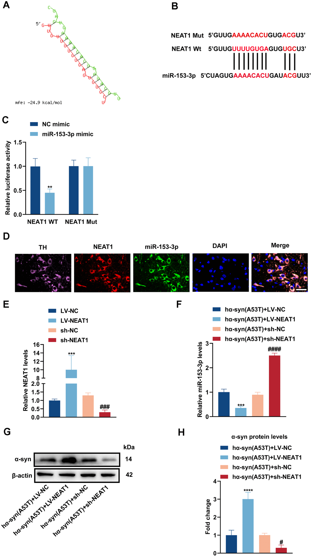 NEAT1 acts as a sponge of miR-153-3p therefore increasing the level of α-syn and apoptosis in the hα-syn(A53T) overexpressed dopaminergic neurons