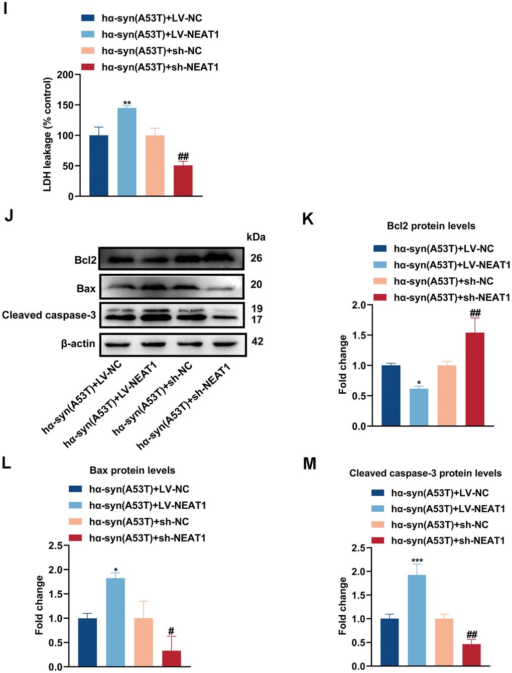 (I) Cell cytotoxicity of primary dopaminergic neurons in each group was tested by LDH assay (n = 3). (J) The levels of Bcl2, Bax and cleaved caspase-3 in every group were observed by Western blot (n = 3). (K) Quantitative evaluation of Bcl2 level. (L) Quantitative evaluation of Bax level. (M) Quantitative evaluation of Cleaved caspase-3 level. Data are shown as the mean ± SD. *P<0.05 and ****P<0.0001 versus the hα-syn(A53T) + LV-NC group; **P<0.01 versus the NC mimic or hα-syn(A53T) + LV-NC group; ***P<0.001 versus the LV-NC or hα-syn(A53T) + LV-NC group; #P<0.05, ##P<0.01 and ####P<0.0001 versus hα-syn(A53T) + sh-NC group; ###P<0.001 versus the sh-NC group.