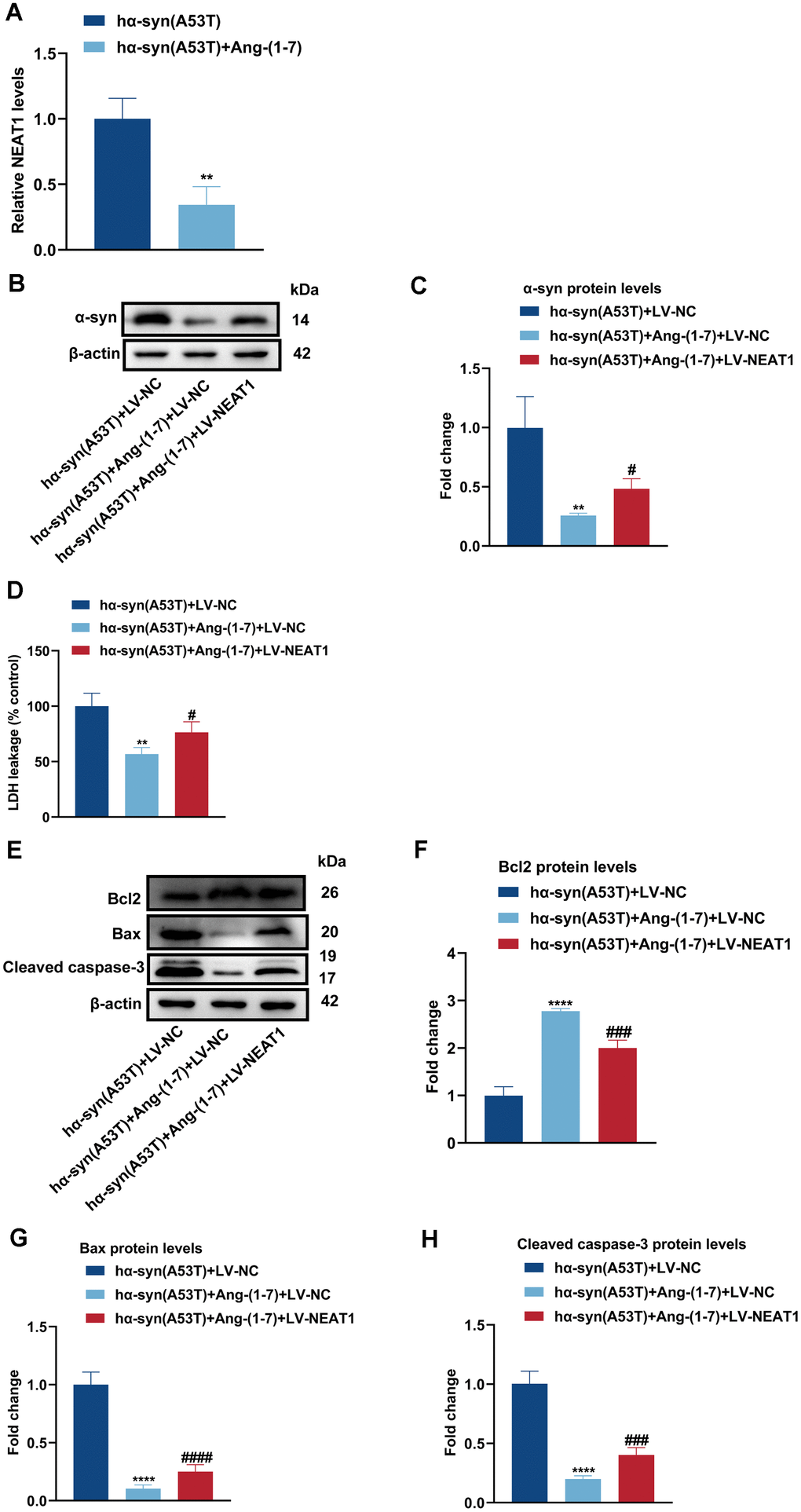 Figure 5A indicated that Ang-(1-7) obviously inhibited the expression of NEAT1 in hα-syn(A53T) overexpressed PD mice. To further explore the interaction between NEAT1 and Ang-(1-7) on the level of α-syn and apoptosis in aforementioned cells, LV-NC or LV-NEAT1 were transfected in hα-syn(A53T) overexpressed neurons. As revealed in Figure 5B, 5C, co-treatment with Ang-(1-7) apparently inhibited the level of α-syn compared with the LV-NC group. However, this variation was reversed when cells transfected with LV-NEAT1 together. Meanwhile, the LDH leakage showed the same variational tendency in three groups with that of α-syn (Figure 5D). Finally, as shown by Figure 5E–5H, Ang-(1-7) evidently heightened the level of Bcl2, whereas reduced the level of Bax and cleaved caspase-3 compared with the sh-NC transfected group. However, transfection of LV-NEAT1 together obviously showed the opposite variation of the three apoptosis-related proteins. All these conclusions showed that Ang-(1-7) decreases the level of α-syn and apoptosis in the hα-syn(A53T) overexpressed dopaminergic neurons in a NEAT1-dependent manner.