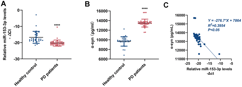 PD patients and healthy controls (healthy individuals with no neurological diseases or family history of PD) from 2021 to 2022 admitted to Nanjing First Hospital took part in this study and have written informed consent. The experiment was allowed by the ethical committee of Nanjing First Hospital (Number: KY20190509-05-KS-01). The PD patients got diagnosis according to the International Parkinson and Movement Disorder Society clinical diagnostic criteria for PD [46]. Exclusion criteria included (1) atypical or secondary parkinsonism; (2) other neurologic injury (traumatic brain injury, stroke, Alzheimer’s disease, epilepsy); (3) acute or chronic inflammatory diseases; (4) cardiovascular disease or malignancies; (5) unstable psychiatric disorders such as schizophrenia or major depression. Healthy controls had no neurological diseases or family history of PD. There was no difference in the age and gender between the two groups. Blood samples from the participants were centrifugated and the upper plasma layer were collected to detect the α-syn expression by enzyme-linked immunosorbent assay (ELISA) kit (KHB0061, Thermo Fisher Scientific, Waltham, MA, USA). The lower samples were separated for RNA and then used to measure the miR-153-3p level by qRT-PCR.