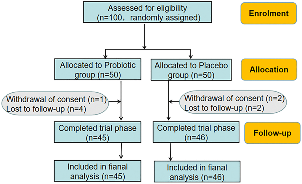According to inclusion and exclusion criteria, 100 individuals were recruited in the trial and were randomly divided into Probiotic group and Placebo group, each with 50 cases respectively. Further, baseline characteristics of the patients in two groups were evaluated. The baseline information (Table 1) showed that there was no significant difference between the two groups in terms of age (40.34 ± 1.77 vs. 38.88±1.64), the history of pregnancy (2.70 ± 0.22 vs. 2.50 ± 0.21) and childbirth (1.50± 0.12 vs. 1.42 ± 0.13), smoking, contraceptive methods, age of initial sexual behavior (19.92 ± 0.33 vs. 19.6 ± 0.36) and number of sexual partners. There was also no statistical difference in the initial HPV viral loads (263.60 ± 25.15 vs. 237.4 ± 25.17), mental stress (6.06 ± 0.15 vs. 5.94 ± 0.14), symptoms prevalence, physical exercise and the family history of cervical cancer. During the study, 1 case withdrew from the consent and 4 cases were lost to follow up in Probiotic group while 2 cases withdrew from the consent and 2 cases were lost to follow up in Placebo group. Finally, 45 cases in Probiotic group and 46 cases in Placebo group completed the trial phase (Figure 1).