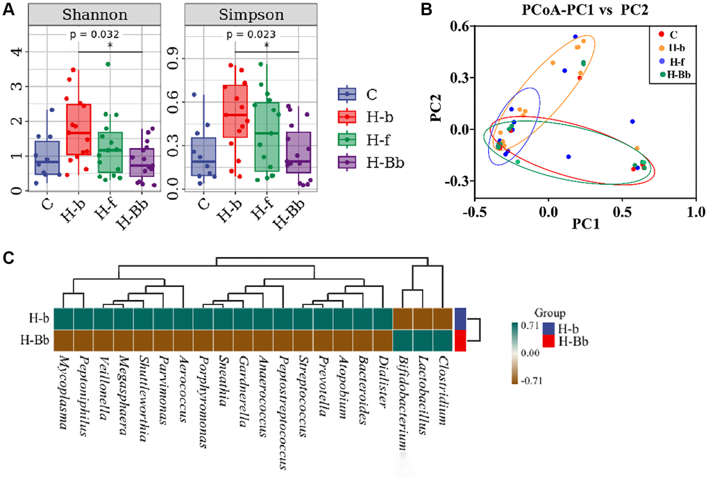 In order to further explore the influence of probiotic intervention on the vaginal microbial composition, Shannon and Simpson indexes were used to assess the alpha diversity of microbial communities. As shown in Figure 2A, Shannon (0.84 ± 0.14 vs. 1.76 ± 0.24, P = 0.032) and Simpson (0.25 ± 0.05 vs. 0.50 ± 0.06, P = 0.023) indexes were significantly reduced in HR-HPV patients after 5 months’ probiotic treatment (H-Bb group) compared with those of HR-HPV patients before enrollment (H-b group). Furthermore, the alpha diversity of microbial communities in group H-Bb with probiotic treatment is similar to that of the healthy people without HR-HPV infection (C group). As for β-diversity, we used principal coordinate analysis (PCoA) to display discrepancy among the four groups (Figure 2B). As shown in Figure 2B, most of the points in the group H-b before probiotic intervention are scattered away from group C, which means that there is a significant deviation of the microbial compositions of HPV infection individuals compared with those of the healthy population. However, after intravaginal treatment with L. crispatus chen-01 for 5 months, the points of probiotic treatment group (H-Bb group) clustered closer to those of the normal healthy population (group C), indicating a more similar species diversity of vaginal microbiota between the two samples.