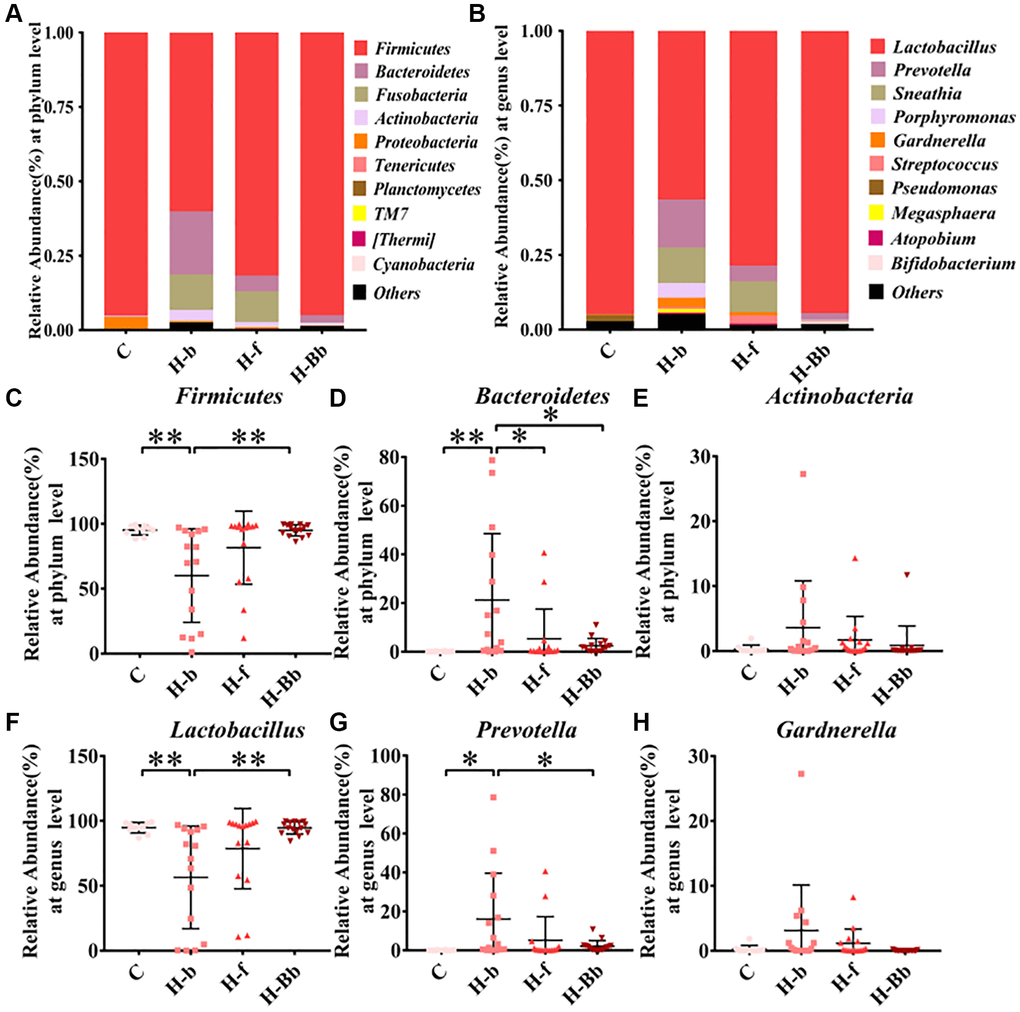 At the genus level, Figure 3B showed that Lactobacillus was the dominant vaginal bacteria accounted for 94.74% (94.74 ± 1.28) in the healthy population (group C), while Prevotella, Sneathia and Gardnerella only account for small proportion. Compared with group C, the proportion of Lactobacillus in HR-HPV patients decreased, while the remaining bacteria increased. When treating with L. crispatus chen-01 in HR-HPV patients (group H-Bb), the abundance of Lactobacillus restored to normal level. In Figure 3F–3H, the abundance of Lactobacillus in HR-HPV patients (H-b group) reduced (56.45 ± 10.21 to 94.74 ± 1.28, P < 0.01) compared with samples from healthy states (group C), while Prevotella and Gardnerella showed the opposite trend, which could be reversed by the supplementation of L. crispatus chen-01, manifesting as a significant increase in Lactobacillus abundance in the H-Bb group (94.50 ± 1.22 to 56.45 ± 10.21, P < 0.01) and a downward trend of Prevotella and Gardnerlla (H-f and H-Bb groups). These results showed a decreased vaginal microbiota abundance post treatment in HR-HPV patients, which means local application of L. crispatus chen-01 significantly improved vaginal microbial composition and was conducive to restore normal vaginal microbiota.