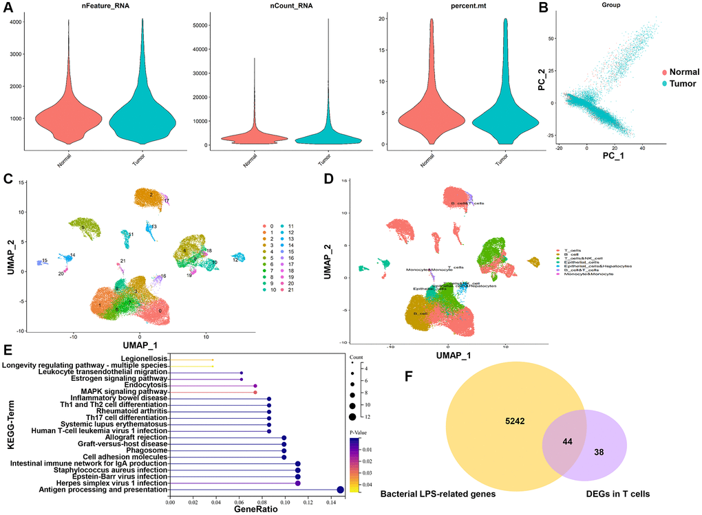 The cell filtration criteria in the scRNA-seq dataset (GSE200997) were consistent with previous study [17]. According to the previous report [17], the filtered data was used to reduce the dimensionality of the features. The cells were then clustered using the FindNeighbors and FindClusters functions. The t-distributed stochastic neighbor embedding, and uniform manifold approximation and projection (UMAP) algorithms were used to reduce the dimensionality and visualize clustering classification based on the first 20 principal components selected. Then, we used SingleR package of R software to annotate the cell types of clusters, with “HumanPrimaryCellAtlasData” as reference [18]. Subsequently, we identified DEGs between tumor and normal cells in T cells using the FindMarkers function with logfc.threshold = 0.585. Moreover, the Kyoto Encyclopedia of Genes and Genomes (KEGG) enrichment analyses of DEGs in T cells were conducted using the Database for Annotation, Visualization and Integrated Discovery (DAVID) database (https://david.ncifcrf.gov/conversion.jsp). Finally, we selected the intersection of DEGs in T cells and bacterial LPS-related genes to obtain TALRGs.