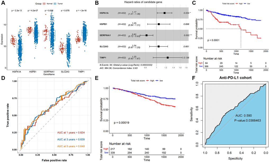 We further studied the association of TALRGs with prognosis, and 5 optimal prognosis-related TALRGs with P < 0.05 were identified using univariate Cox analysis (Table 1), namely HSPA1A, HSPB1, SERPINA1, SLC2A3, and TIMP1. Compared with normal samples, the expressions of HSPA1A, HSPB1 and SERPINA1 were down-regulated in tumor samples, while TIMP1 was up-regulated in tumor samples. SLC2A3 expression had no significant difference between normal and tumor samples (Figure 2A). Furthermore, Kaplan–Meier survival analyses demonstrated that patients with increased HSPA1A (P = 0.018, Supplementary Figure 1A), SLC2A3 (P = 0.0073, Supplementary Figure 1D), and TIMP1 (P = 0.0031, Supplementary Figure 1E) showed poor survival, while patients with increased SERPINA1 indicated favorable survival (P = 0.02, Supplementary Figure 1C). There was no significant relationship between HSPB1 expression and OS (P = 0.28, Supplementary Figure 1B). Subsequently, multivariate Cox analysis established a TALRGs signature based on the TCGA-COAD cohort, and the hazard ratio of each gene was shown in Figure 2B. All patients were then divided into high- and low-risk groups based on the median risk score. The formula for the risk score model was as follows: risk score = (0.15872 × expression value of HSPA1A) + (0.04431 × expression value of HSPB1) + (−0.19961 × expression value of SERPINA1) + (0.0404 × expression value of SLC2A3) + (0.22075 × expression value of TIMP1). The Kaplan–Meier analysis manifested low-risk patients had a better survival advantage (P < 0.0001, Figure 2C). In addition, the area under the curve (AUC) of the TCGA-COAD cohort was 0.624 (at 1-years), 0.639 (at 3-years), and 0.648 (at 5-years), respectively (Figure 2D). The model was validated in the GSE39582 cohort. The OS rate of the low-risk group was higher than that of the high-risk group (P = 0.00019, Figure 2E). The AUC of anti-PD-L1 cohort was 0.59 with P = 0.0366463 (Figure 2F). These results suggested that TALRGs prognostic model is effective in predicting the prognosis of CRC patients.