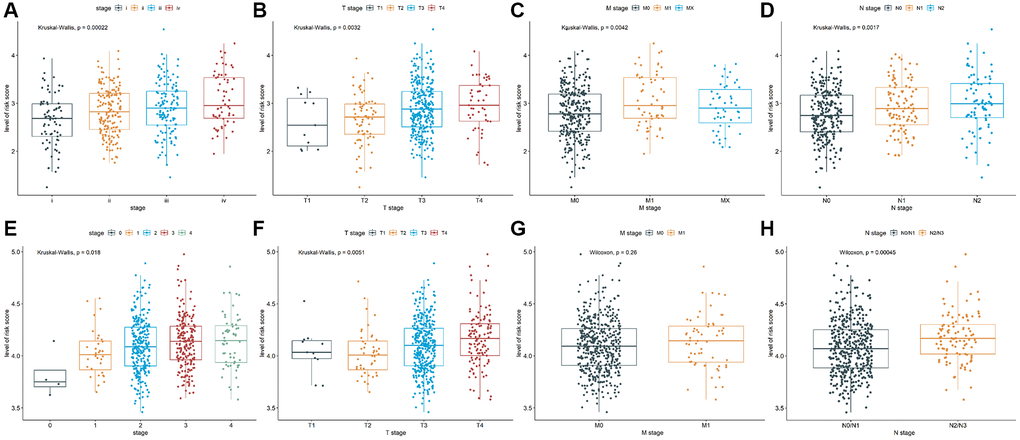 TCGA-COAD cohort and GSE39582 dataset were performed to validate the prognostic capability of TALRGs prognostic model. According to the constructed risk scoring model, the dataset was divided into high-risk group and low-risk group. Kruskal-Wallis test and Wilcoxon test were used to investigate the relationship between TALRGs prognostic model and clinicopathological characteristics, including pathological stage and TNM stage.