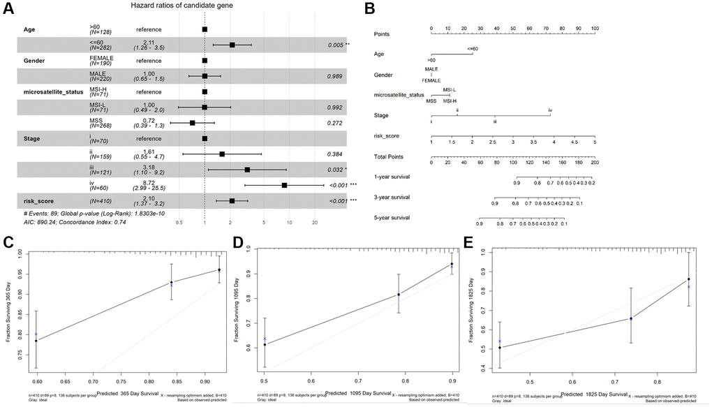 As shown in Figure 4A, age (≤ 60), stage III and IV, and risk score were observably associated with OS (P < 0.05), while gender, microsatellite status, stage I and II were not (P > 0.05). Then, we constructed a nomogram plot to ameliorate the accuracy of TALRGs signature and provided a quantitative and intuitive way to predict 1-, 3-, and 5-years survival probabilities for CRC patients (Figure 4B). We can determine the total score based on the individual score and thus predict the probability of survival of the patient at 1-, 3-, and 5-years. In addition, the calibration curves of the model showed that the predicted curves are close to the ideal curves, indicating that the nomogram has a good prediction performance (Figure 4C–4E).