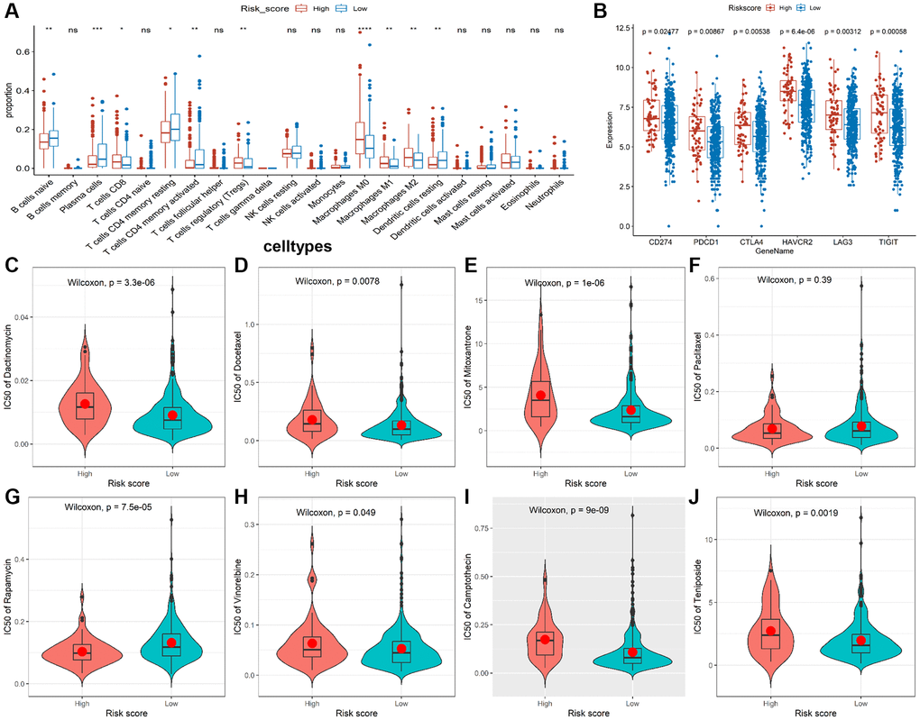 Given that the characteristics of tumor immune infiltrating cells are associated with tumor development and progression and may affect the prognosis of CRC, we used the CIBERSORT method to compare the immune infiltration of 22 immune cells in different risk groups. The results showed B cells, plasma cells, resting CD4+ T cells, activated CD4+ T cells, and resting dendritic cell (DC) cells were more abundant in the low-risk group, while CD8+ T cells, T regulatory cells (Tregs), and M0/M1/M2 macrophages were more abundant in the high-risk group (Figure 5A). In addition, we analyzed correlations between the risk model and CD274 (PDL1), PDCD1 (PD1), CTLA4, HAVCR2 (TIM3), LAG3, and TIGIT. We found observably higher expressions of all immune checkpoint molecules in the high-risk group (Figure 5B), indicating that immune function is suppressed in high-risk patients. Moreover, we discovered the IC50 of dactinomycin, docetaxel, mitoxantrone, vinorelbine, camptothecin, and teniposide was higher in the high-risk group, while the IC50 of rapamycin was higher in the low-risk group (Figure 5C–5J), suggesting that patients in the high-risk group are more resistant to most chemotherapy drugs.