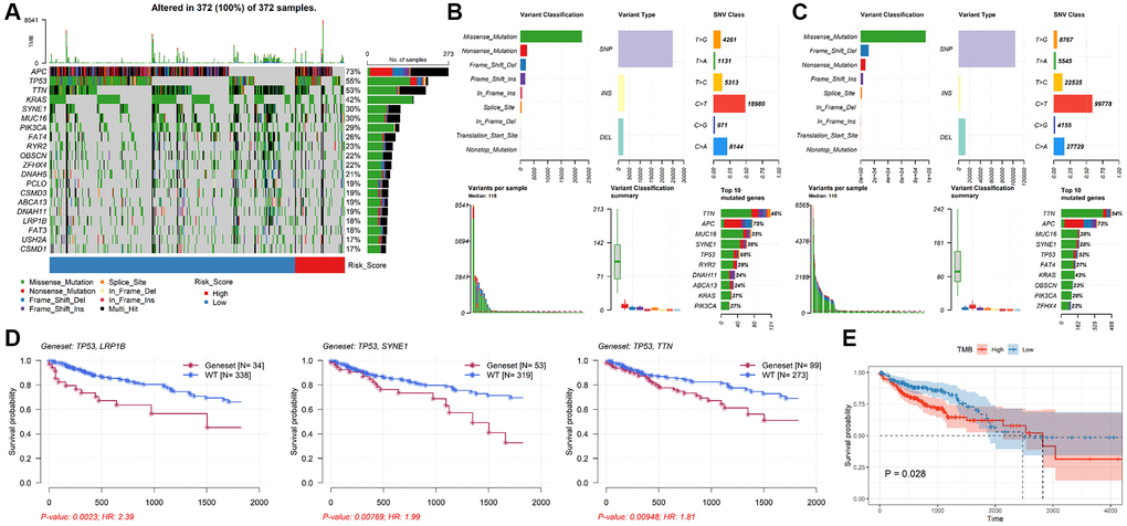 Genetic alteration analysis showed that APC, TP53, TTN, KRAS, SYNE1, MUC16, PIK3CA, FAT4, RYR2 and OBSCN were the mutation rates of the top 10 genes in CRC patients (Figure 6A). The mutant profiles of high-risk and low-risk patients were shown in Supplementary Figure 2A, 2B, respectively. Besides, patients in the high-risk group had a higher median number of mutations than those in the low-risk group (118 vs. 110). In the high-risk group, single nucleotide polymorphism (SNP) was the most variant type, missense mutation was the most common SNP classification, and C > T was the main single nucleotide variants (SNV) class, and TTN, APC, MUC16, SYNE1, TP53, RYR2, DNAH11, ABCA13, KRAS, PIK32CA were the top 10 mutated genes in patients in the high-risk group (Figure 6B). Except for the top 10 mutated genes (TTN, APC, MUC16, SYNE1, TP53, FAT4, KRAS, OBSCN, PIK3CA, ZFHX4), the mutation profiles of the low-risk group were similar to that of the high-risk group (Figure 6C). Moreover, the mutation rate of TP53 in the high-risk group was significantly higher than in low-risk group (P = 0.0257, Supplementary Figure 2C). The mutation status of TP53 didn’t affect patients’ OS (P = 0.183, Supplementary Figure 2D), while TP53 combined with mutations in other genes (e.g. LRP18, SYNE1, TTN) significantly reduced survival time (Figure 6D). In addition, the median TMB value was 2.22/Mb in CRC patients (Supplementary Figure 2E), and there was no significant difference in TMB value between low-risk group and high-risk group (P = 0.8, Supplementary Figure 2F). However, patients with lower TMB had better prognosis (P = 0.028, Figure 6E).