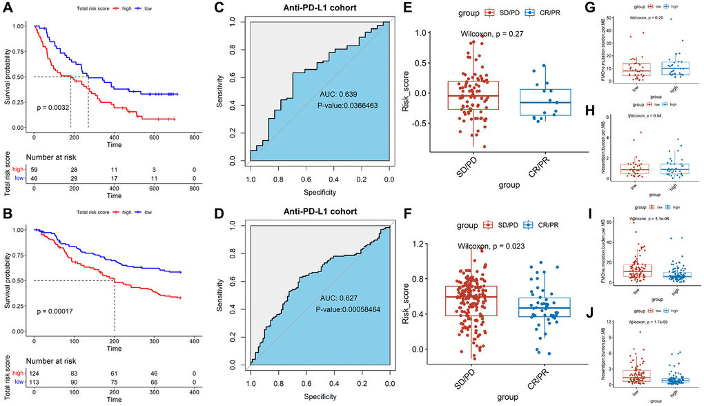 In order to evaluate the predictive effect of TALRGs signature on immunotherapy, we further validated constructed risk score model using the platinum-treated cohort and the non-platinum-treated cohort. The results exhibited patients with low-risk scores had significantly longer survival times (platinum-treated cohort: P = 0.0032, Figure 7A; non-platinum-treated cohort: P = 0.00017, Figure 7B). The AUCs of constructed model in anti-PD-L1 cohorts were 0.639 (platinum-treated cohort, Figure 7C) and 0.627 (non-platinum-treated cohort, Figure 7D), respectively. The clinical benefit of immunotherapy was not significant in patients receiving platinum therapy (P = 0.27, Figure 7E), while patients receiving non-platinum therapy marked clinical benefits from immunotherapy in the low-risk score group compared to those with a high-risk score group (P = 0.023, Figure 7F). In addition, higher tumor mutation load and higher neoantigen burden in platinum-treated patients was not significantly associated with risk score (P = 0.29, Figure 7G; P = 0.94, Figure 7H), while non-platinum-treated patients were associated with a low-risk score (P = 5.1e-06, Figure 7I; P = 1.7e-05, Figure 7J). These findings demonstrated that TALRGs signature is effective in predicting the prognosis of immunotherapy patients.