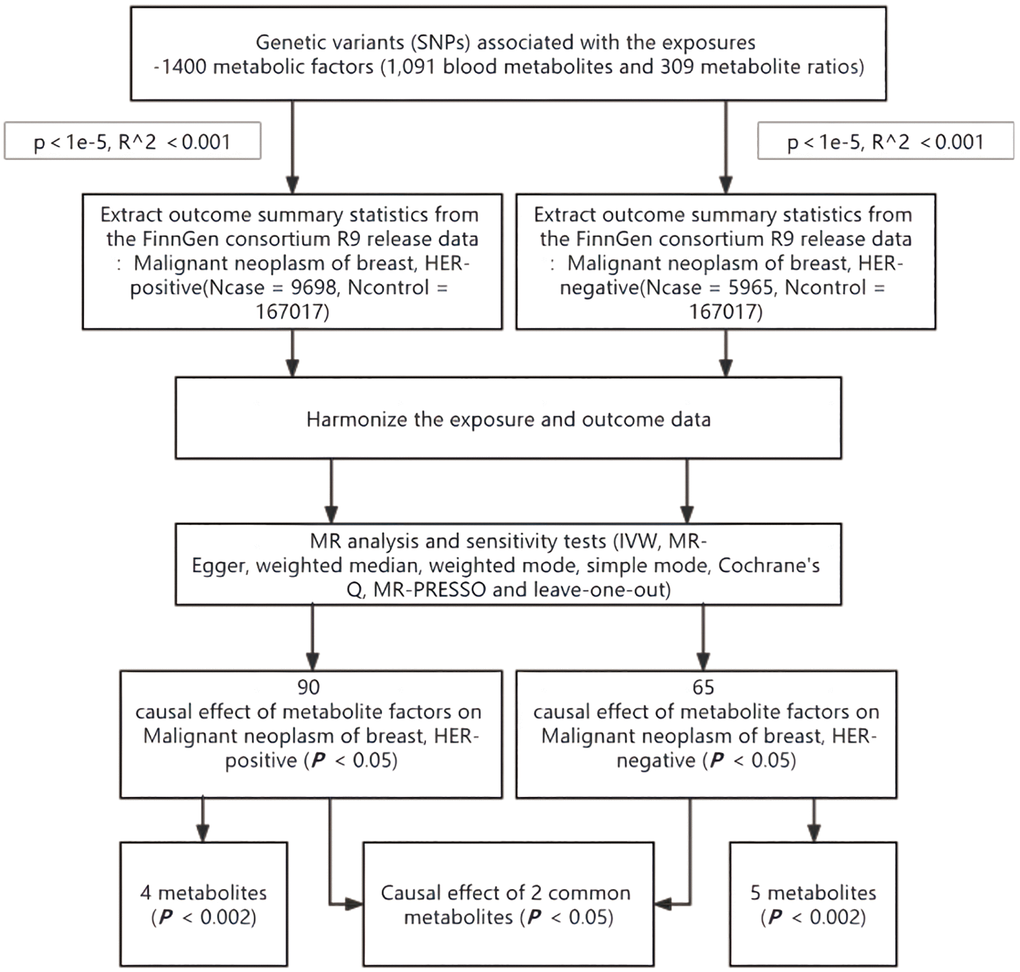 We employed a two-sample MR approach utilizing publicly available datasets that provide genome-wide association outcomes for metabolic factors, HER+ breast cancer and HER- breast cancer. Two-sample MR involves the use of distinct datasets or samples to establish the gene–risk factor associations (e.g., blood metabolites and metabolite ratios traits) and the gene–outcome associations (e.g., malignant neoplasm of breast, HER-positive/malignant neoplasm of breast, HER-negative).