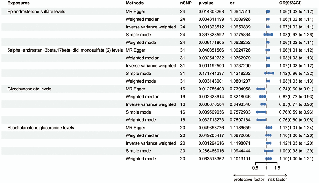 The IVW method showed evidence to support that ninety metabolites were identified at a significance of 0.05, so set the p-value to 0.002 and detected risk effects of three metabolites on HER+ breast cancer: Epiandrosterone sulfate levels, 5alpha-androstan-3beta,17beta-diol monosulfate (2) levels and Etiocholanolone glucuronide levels. One metabolite was detected as protective effect: Glycohyocholate levels (Figure 2). The odds ratio (OR) of Epiandrosterone sulfate levels on HER+ breast cancer was estimated to be 1.07 (95% CI = 1.02 ~ 1.10, p = 0.0013, Supplementary Table 1) by using the IVW method. Similar results were observed by using three more methods: MR Egger (OR =1.06, 95% CI = 1.01 ~ 1.11, p = 0.0148), weighted median (OR = 1.06, 95% CI = 1.02 ~ 1.11, p = 0.0043) and weighted mode (OR = 1.06, 95% CI = 1.02 ~ 1.11, p = 0.0061). However, except the simple mode (OR = 0.98, 95% CI = 0.95 ~ 1.02, p = 0.3877). The OR of 5alpha-androstan-3beta,17beta-diol monosulfate (2) levels on HER+ breast cancer was estimated to be 1.07 (95% CI = 1.03 ~ 1.12, p = 0.0012, Supplementary Table 2) by using the IVW method. Similar results were observed by using three more methods: MR Egger (OR =1.06, 95% CI = 1.01 ~ 1.12, p = 0.0409), weighted median (OR = 1.08, 95% CI = 1.03 ~ 1.13, p = 0.0025) and weighted mode (OR = 1.08, 95% CI = 1.03 ~ 1.13, p = 0.0031). But the simple mode (OR = 1.12, 95% CI = 0.96 ~ 1.32, p = 0.1717) did not support this association. The OR of Glycohyocholate levels on HER+ breast cancer was estimated to be 0.85 (95% CI = 0.77 ~ 0.93, p = 0.0007, Supplementary Table 3) by using the IVW method. Similar results were observed by using four more methods: MR Egger (OR = 0.74, 95% CI = 0.60 ~ 0.91, p = 0.0128), weighted median (OR = 0.82, 95% CI = 0.72 ~ 0.94, p = 0.0026), simple mode (OR = 0.76, 95% CI = 0.59 ~ 0.96, p = 0.0396) and weighted mode (OR = 0.76, 95% CI = 0.60 ~ 0.96, p = 0.0327). The OR of Etiocholanolone glucuronide levels on HER+ breast cancer was estimated to be 1.12 (95% CI = 1.05 ~ 1.20, p = 0.0013, Supplementary Table 4) by using the IVW method. Similar results were observed by using two more methods: MR Egger (OR = 1.19, 95% CI = 1.01 ~ 1.24, p = 0.0494) and weighted median (OR = 1.10, 95% CI = 1.00 ~ 1.20, p = 0.0492). However, simple mode (OR = 1.09, 95% CI = 0.93 ~ 1.29, p = 0.2865) and weighted mode (OR = 1.10, 95% CI = 1.00 ~ 1.21, p = 0.0635) did not support this association. These trends are also evident in the forest plots (Supplementary Figure 1A–1D) and scatter plots (Supplementary Figure 2A–2D).