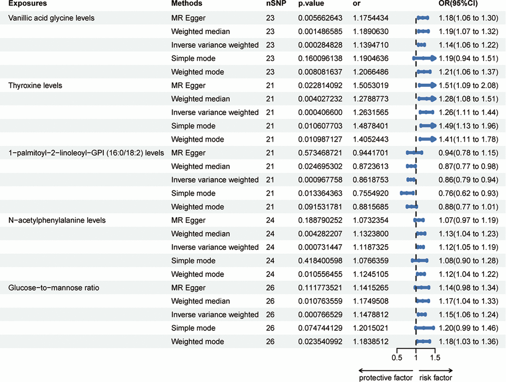 Sixty-five metabolites were identified to be significant at a p-value of 0.05 using the IVW method; subsequently, setting the p-value to 0.002 revealed the risk effects of four metabolites on HER-negative breast cancer: Vanillic acid glycine levels, Thyroxine levels, N-acetylphenylalanine levels and Glucose-to-mannose ratio. Meanwhile, 1-palmitoyl-2-linoleoyl-GPI (16:0/18:2) levels was detected as a protective effector (Figure 3). The odds ratio (OR) for Vanillic acid glycine levels and the risk of HER- breast cancer was estimated to be 1.14 (95% CI = 1.06 ~ 1.22, p = 0.0003, Supplementary Table 5) using the IVW method. Consistent results were obtained with three other methods: MR Egger (OR = 1.18, 95% CI = 1.06 ~ 1.30, p = 0.0057), weighted median (OR = 1.19, 95% CI = 1.07 ~ 1.32, p = 0.0015), and weighted mode (OR = 1.21, 95% CI = 1.06 ~ 1.37, p = 0.0080). However, the simple mode did not provide support for this association (OR = 1.19, 95% CI = 0.94 ~ 1.51, p = 0.1601). Thyroxine levels showed an OR of 1.26 (95% CI = 1.11 ~ 1.44, p = 0.0004, Supplementary Table 6) for HER- breast cancer risk using the IVW method. Similar results were observed with four additional methods: MR Egger (OR = 1.51, 95% CI = 1.09 ~ 2.08, p = 0.0228), weighted median (OR = 1.28, 95% CI = 1.08 ~ 1.51, p = 0.0040), simple mode (OR = 1.49, 95% CI = 1.13 ~ 1.96, p = 0.0106), and weighted mode (OR = 1.41, 95% CI = 1.11 ~ 1.78, p = 0.0110). For 1-palmitoyl-2-linoleoyl-GPI (16:0/18:2) levels, the OR for HER- breast cancer risk was estimated as 0.86 (95% CI = 0.79 ~ 0.94, p = 0.0010, Supplementary Table 7) using the IVW method. The weighted median (OR = 0.87, 95% CI = 0.77 ~ 0.98, p = 0.0247) and simple mode (OR = 0.75, 95% CI = 0.62 ~ 0.93, p = 0.0134) also supported this association. However, the MR Egger (OR = 0.94, 95% CI = 0.78 ~ 1.15, p = 0.5735) and weighted mode (OR = 0.88, 95% CI = 0.77 ~ 1.01, p = 0.0915) did not find evidence to support this relationship. N-acetylphenylalanine levels exhibited an OR of 1.12 (95% CI = 1.05 ~ 1.19, p = 0.0007, Supplementary Table 8) for HER- breast cancer risk using the IVW method. Consistent results were obtained with the weighted median (OR = 1.13, 95% CI = 1.04 ~ 1.23, p = 0.0043) and weighted mode (OR = 1.12, 95% CI = 1.04 ~ 1.22, p = 0.0106). However, the MR Egger (OR = 1.07, 95% CI = 0.97 ~ 1.19, p = 0.1888) and simple mode did not support this association (OR = 1.08, 95% CI = 0.90 ~ 1.28, p = 0.4184). The OR for Glucose-to-mannose ratio and HER- breast cancer risk was estimated as 1.15 (95% CI = 1.06 ~ 1.24, p = 0.0008, Supplementary Table 9) using the IVW method. Consistent results were observed with the weighted median (OR = 1.17, 95% CI = 1.04 ~ 1.33, p = 0.0108) and weighted mode (OR = 1.18, 95% CI = 1.03 ~ 1.36, p = 0.0235). However, the MR Egger (OR = 1.14, 95% CI = 0.98 ~ 1.34, p = 0.1118) and simple mode (OR = 1.20, 95% CI = 0.99 ~ 1.46, p = 0.0747) did not support this association. These associations are also noticeable in both the forest plots (Supplementary Figure 1E–1I) and scatter plots (Supplementary Figure 2E–2I).