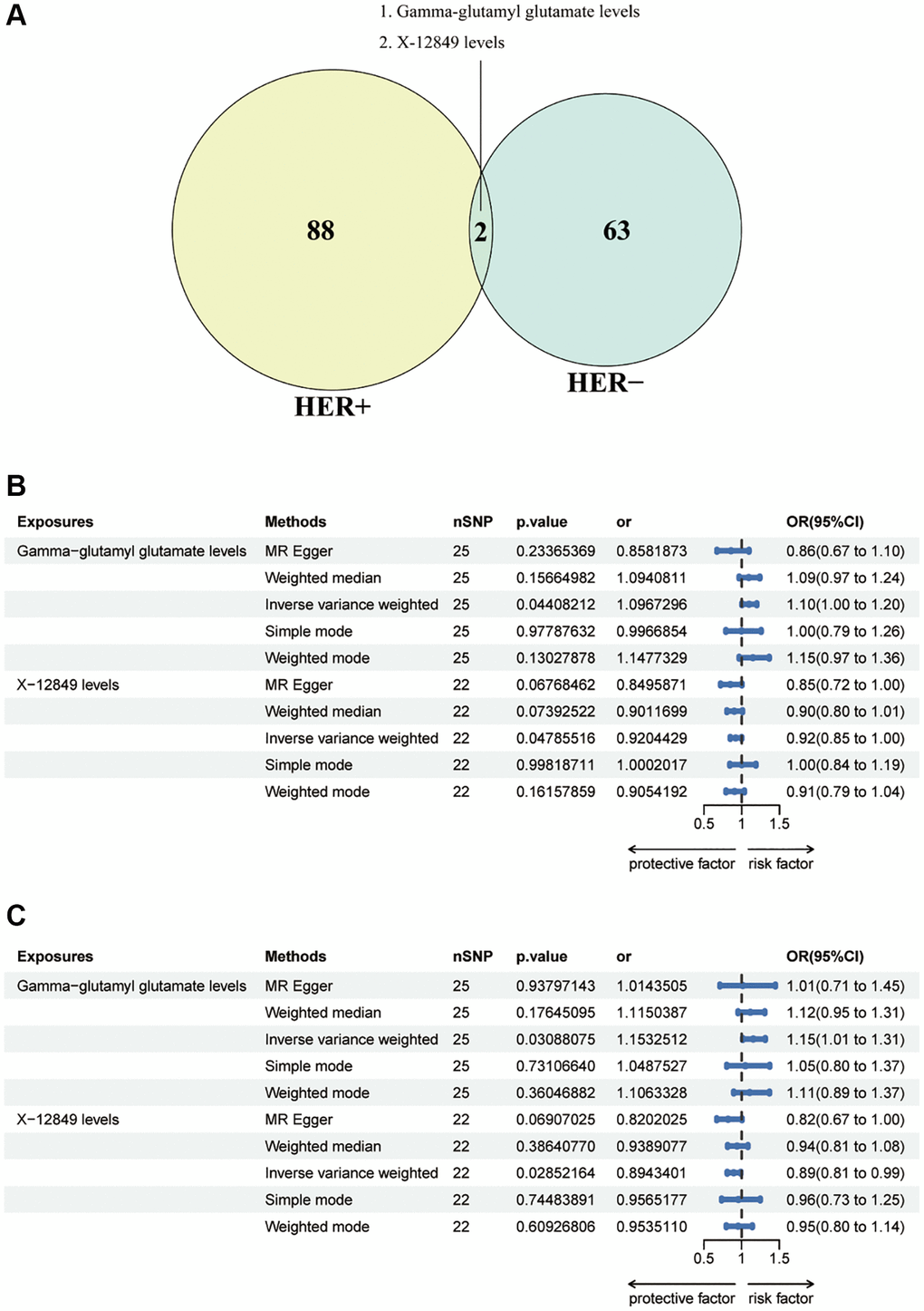 In order to examine the causal effects of common metabolites on both HER+ and HER– breast cancer, we identified a total of 90 metabolites associated with HER+ breast cancer and 65 metabolites associated with HER- breast cancer at a significance level of 0.05 using the IVW method as the primary analysis. By taking the intersection of these sets, we detected two metabolites that were consistently present in both HER+ and HER- breast cancer: Gamma-glutamyl glutamate levels and X-12849 levels (Figure 4A). Interestingly, Gamma-glutamyl glutamate levels were found to act as risk effectors in both HER+ and HER- breast cancer, while X-12849 levels exhibited a protective effect (Figure 4B, 4C). The association between Gamma-glutamyl glutamate levels and HER+ breast cancer risk was estimated to have an odds ratio (OR) of 1.26 (95% CI = 0.67 ~ 1.10, p = 0.0004) using the IVW method. However, other methods such as MR Egger (OR = 0.86, 95% CI = 1.09 ~ 2.08, p = 0.2337), weighted median (OR = 1.09, 95% CI = 0.97 ~ 1.24, p = 0.1567), simple mode (OR = 0.99, 95% CI = 0.79 ~ 1.26, p = 0.9779), and weighted mode (OR = 1.15, 95% CI = 0.97 ~ 1.36, p = 0.1303) did not support this association (Supplementary Table 10). The MR Egger analysis, weighted median, simple mode, and weighted mode did not provide evidence for a causal relationship. Similarly, the OR of X-12849 levels on HER+ breast cancer risk was estimated as 0.92 (95% CI = 0.85 ~ 1.00, p = 0.0479) using the IVW method. However, the MR Egger (OR = 0.85, 95% CI = 0.72 ~ 1.00, p = 0.0677), weighted median (OR = 0.90, 95% CI = 0.80 ~ 1.01, p = 0.0739), simple mode (OR = 1.00, 95% CI = 0.84 ~ 1.19, p = 0.9982), and weighted mode (OR = 0.91, 95% CI = 0.79 ~ 1.04, p = 0.1616) did not support this association (Supplementary Table 11). Regarding HER- breast cancer risk, the OR of Gamma-glutamyl glutamate levels was estimated as 1.15 (95% CI = 1.01 ~ 1.31, p = 0.0309) using the IVW method. However, the MR Egger (OR = 1.01, 95% CI = 0.71 ~ 1.45, p = 0.9380), weighted median (OR = 1.12, 95% CI = 0.95 ~ 1.31, p = 0.1765), simple mode (OR = 1.05, 95% CI = 0.80 ~ 1.37, p = 0.7311), and weighted mode (OR = 1.11, 95% CI = 0.89 ~ 1.37, p = 0.3605) did not support this association (Supplementary Table 12). Similarly, the OR of X-12849 levels on HER- breast cancer risk was estimated as 0.89 (95% CI = 0.81 ~ 0.99, p = 0.0285) using the IVW method. However, the MR Egger (OR = 0.82, 95% CI = 0.67 ~ 1.00, p = 0.0691), weighted median (OR = 0.94, 95% CI = 0.81 ~ 1.08, p = 0.3864), simple mode (OR = 0.96, 95% CI = 0.73 ~ 1.25, p = 0.7448), and weighted mode (OR = 0.95, 95% CI = 0.80 ~ 1.14, p = 0.6093) did not support this association (Supplementary Table 13). These results could also be observed in the forest plots and scatter plots (Supplementary Figure 3).