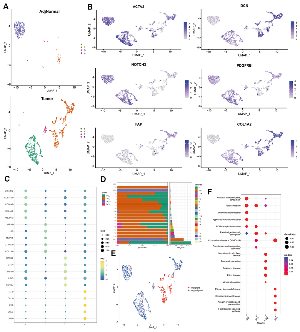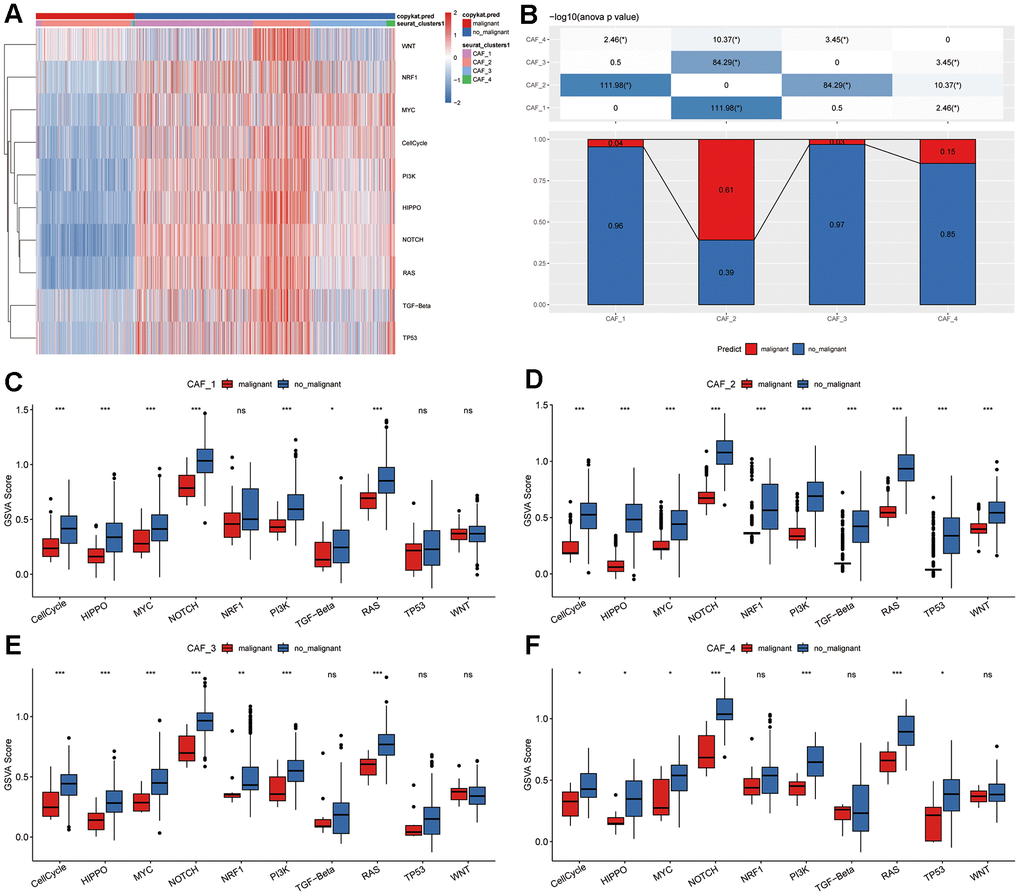To investigate the potential role of CAF clusters in tumorigenesis, the expression of ten tumor-related pathways were evaluated in the four CAF clusters, including WNT, NRF1, MYC, CellCycle, PI3K, HIPPO, NOTCH, RAS, TGF-Beta, and TP53 signaling pathways. The GSVA scores of these pathways across the four CAF clusters were presented in the heatmap (Figure 2A). CAF_2 cluster exhibited notably higher proportions of malignant cells compared to the other three clusters (Figure 2B). Moreover, the CAF_4 cluster displayed a higher proportion of malignant cells compared to both CAF_1 and CAF_3 clusters. Furthermore, we conducted a comparison of GSVA scores for ten tumor-related pathways between malignant and non-malignant cells within each CAF cluster (Figure 2C–2F). Non-malignant cells had considerably higher GSVA scores for most signaling pathways in all CAF clusters, while minor variations among groups were observed.