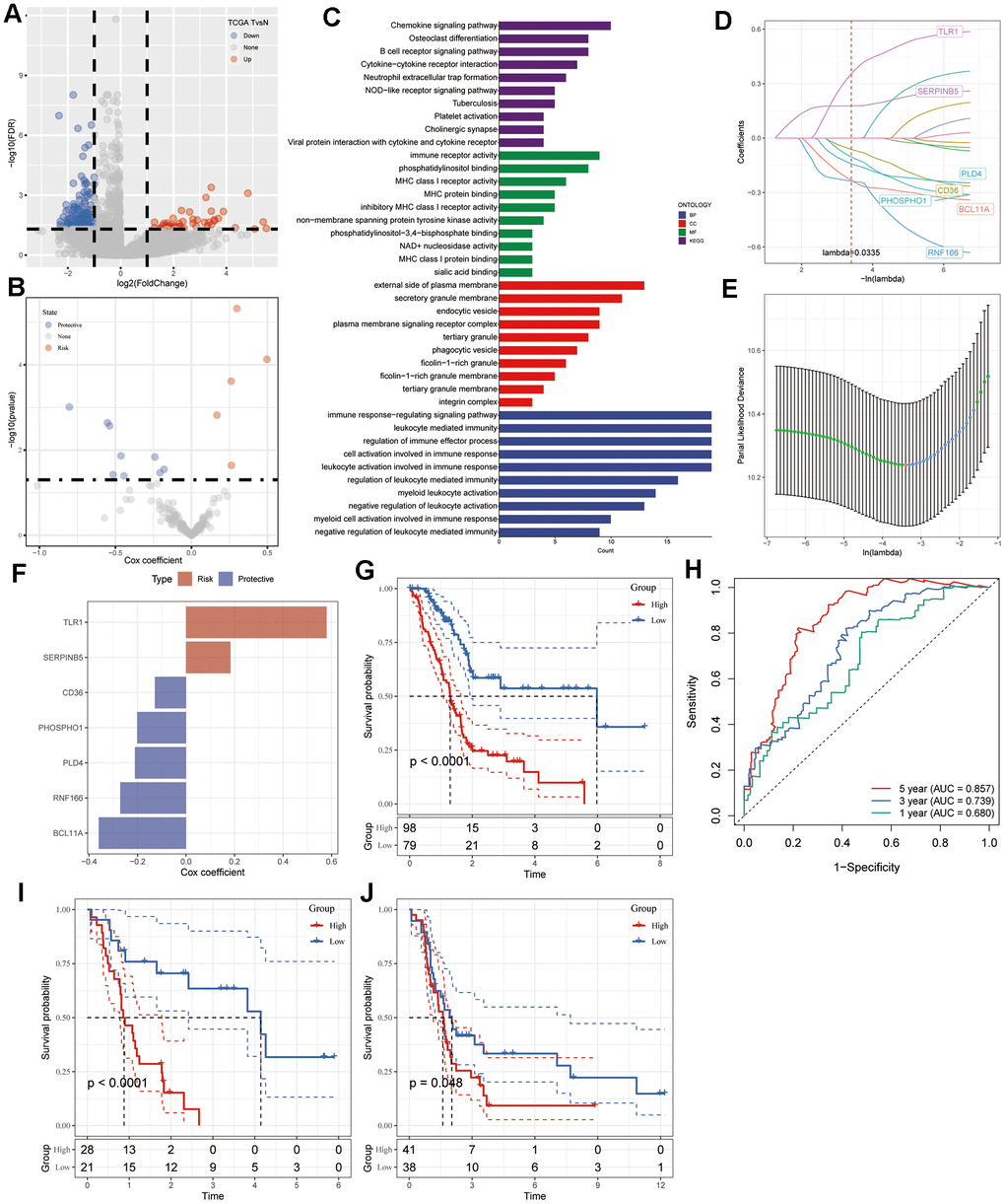 We then investigated the association between the seven prognostic genes and immune infiltration. Initially, we computed the immune score, stromal score, and ESTIMATE score utilizing the ESTIMATE algorithm (Supplementary Figure 3A–3D). Our correlation analysis revealed that CD36, PHOSPHO1, PLD4, TLR1, and RNF166 exhibited positive correlations with stromal score, immune score, and ESTIMATE score. Conversely, BCL11A showed positive correlations solely with immune score and ESTIMATE score. Notably, SERPINB5 did not display significant correlations with any of these three scores. We then compared the immune score across groups that were defined by the median expression level of respective genes. For the genes CD36, PHOSPHO1, PLD4, TLR1, BCL11A, and RNF166, individuals with high expression had significantly higher immune score than those with low expression (Supplementary Figure 3E–3K). However, individuals with low SERPINB5 expression had higher immune score. We utilized the CIBERSORT algorithm to compute the abundance of infiltrating immune cells and their correlations with the seven prognostic genes. The correlation heatmap showed that CD36, PHOSPHO1, PLD4, BCL11A, and RNF166 presented a significantly positive correlation with CD8+ T cells, naïve and memory B cells, whereas negative correlation with CD4+ memory resting T cells. TLR1 was positively correlated with CD4+ memory activated T cells, while negatively correlated with activated NK cells and activated mast cells, similar to SERPINB5 (Supplementary Figure 3L). We further validated our results using the MCPcounter algorithm. Significantly positive correlations were observed between RNF166, TLR1, PLD4, PHOSPHO1, CD36, and infiltrating immune cells, while SERPINB5 was only positively correlated with fibroblasts, which was consistent with previous results (Supplementary Figure 3M).