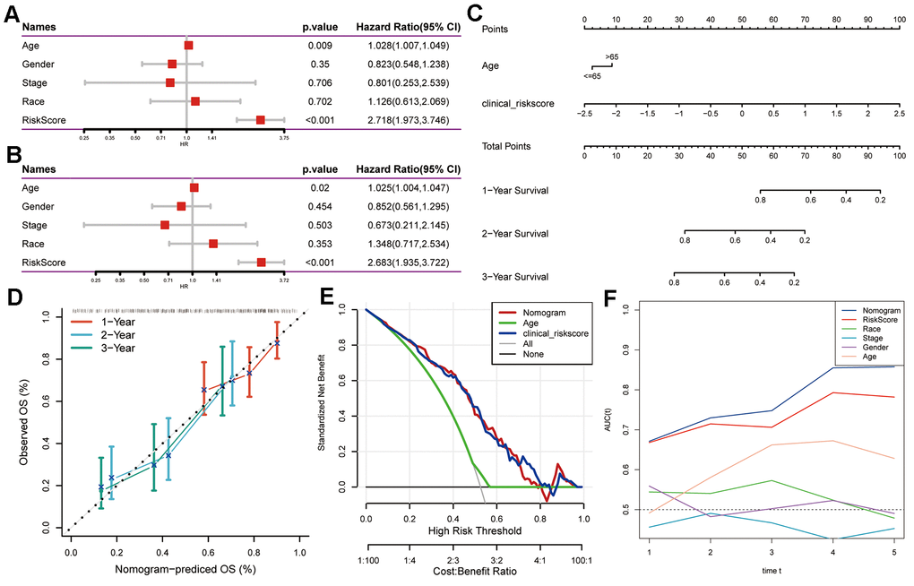To create a clinically applicable nomogram model, we initiated univariate and multivariate Cox regression analyses incorporating the risk signature and clinicopathological factors such as age, gender, stage, and race. The resulting multivariate Cox model, including variables with P < 0.05, was utilized to devise a prognostic nomogram for PAAD using the rms package [21]. The prediction efficacy of the model was assessed by the calibration curve and the reliability was assessed using decision curve analysis (DCA).
