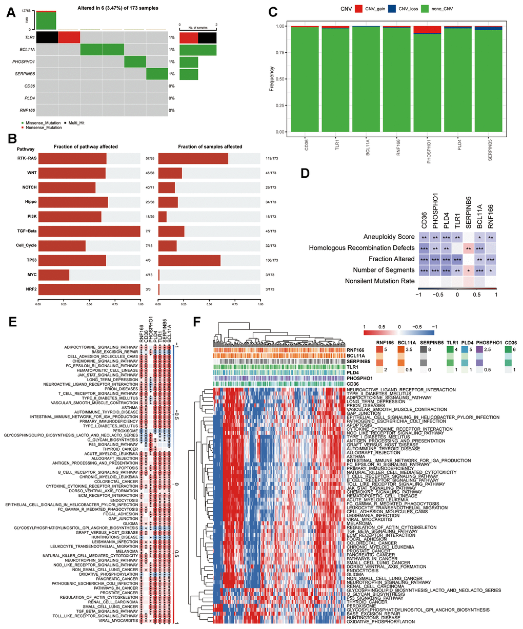 The genetic mutations (SNV) within the seven genes forming the risk signature were subsequently examined. More samples were found to contain SNV mutations in TLR1, BCL11A, PHOSPHO1, and SERPINB5, however, no SNV mutation was found in CD36, PLD4, or RNF166 (Figure 5A). Pathway enrichment on SNV data showed that TGF-Beta and NRF2 pathways were the most affected pathways in PAAD, while more samples were involved in the RTK-RAS and TP53 pathways (Figure 5B). Within the seven genes comprising the risk signature, only a few samples displayed CNV alterations (Figure 5C). Hence, we explored the connections between these risk genes and diverse molecular indicators in PAAD, aiming to enhance our understanding of how these genes are linked to the disease. The results demonstrated that CD36, PHOSPHO1, PLD4, TLR1, BCL11A, and RNF166 were all significantly negatively correlated with Aneuploidy Score, Fraction Altered, and Number of Segments, whereas SERPINB5 exhibited notably positive correlations with Homologous Recombination Defects and Number of Segments (Figure 5D). Interestingly, the Nonsilent Mutation Rate displayed no correlation with any of these identified risk genes. Additionally, we delved into the potential pathways linked to each risk gene (Figure 5E, 5F). The heatmap revealed significant correlations of these seven genes with a total of 60 pathways, encompassing pathways like adipocytokine signaling pathway, base excision repair, and cell adhesion molecules cams.