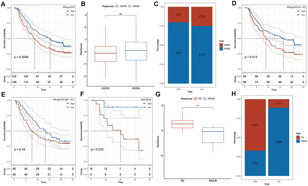 The utilization of T-cell immunotherapy in cancer treatment has shown promise in extending patients’ survival. Consequently, we conducted an analysis on the IMvigor210 and GSE78220 cohorts to evaluate the predictive efficacy of the risk signature for immune-checkpoint therapy. Patients categorized in the IMvigor210 low-risk group exhibited better clinical outcomes and longer overall survival in comparison to those in the high-risk group (Figure 6A, P = 0.0049). However, no significant difference in risk score was observed between patients with complete/partial response (CR/PR) and those with progressive/stable disease (PD/SD), and the proportion of PD/SD patients in the high-risk group did not significantly differ from that in the low-risk group (Figure 6B, 6C). Particularly, substantial differences in survival probability were noted among various risk groups for patients diagnosed at Stages I and II (Figure 6D, P = 0.013), but not for those at Stages III and IV (Figure 6E, P = 0.19). These findings suggested higher sensitivity of the risk score for patients diagnosed at earlier stages. Similarly, patients within the low-risk group in the GSE78220 cohort displayed significantly prolonged overall survival compared to those in the high-risk group (Figure 6F, P = 0.033). Moreover, in contrast to IMvigor210, PD patients exhibited notably higher risk scores than PR/CR patients (Figure 6G), and the proportion of PD patients in the high-risk group was significantly elevated compared to the low-risk group in the GSE78220 cohort (Figure 6H). These outcomes indicate the effective predictive capacity of the risk signature in determining patient responses to immunotherapy.
