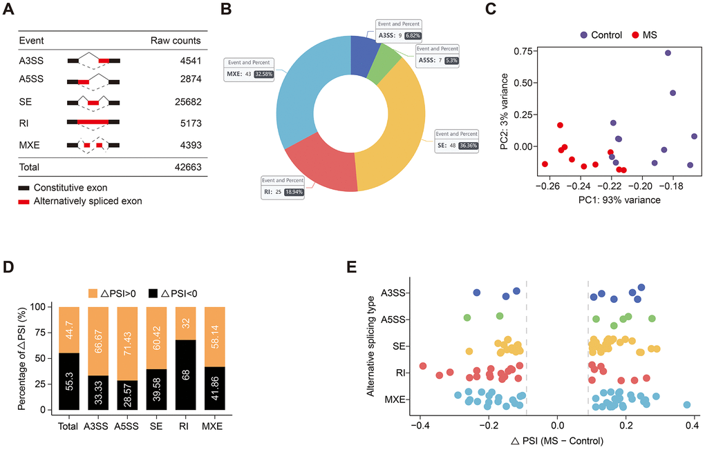 Altogether, 42,663 AS events were detected in the GSE111972 datasets (Figure 1A). Initially, we sought to identify differential AS events between MS and control subjects. We employed rMATS to quantify the percent spliced in (PSI) value for each AS event. Utilizing stringent criteria (average coverage > 10 and ∆PSI > 0.1), we identified, on average, 132 significant AS events (Figure 1B). Principal component analysis (PCA) of AS events effectively distinguished between MS and control groups (Figure 1C). PSI values were found to be elevated in A3SS, A5SS, SE, and MXE events, whereas RI and total AS events exhibited decreased PSI (Figure 1D, 1E). The top 2 events in each AS type are shown in Table 1, while all 132 significant AS events are listed in Supplementary Table 1.