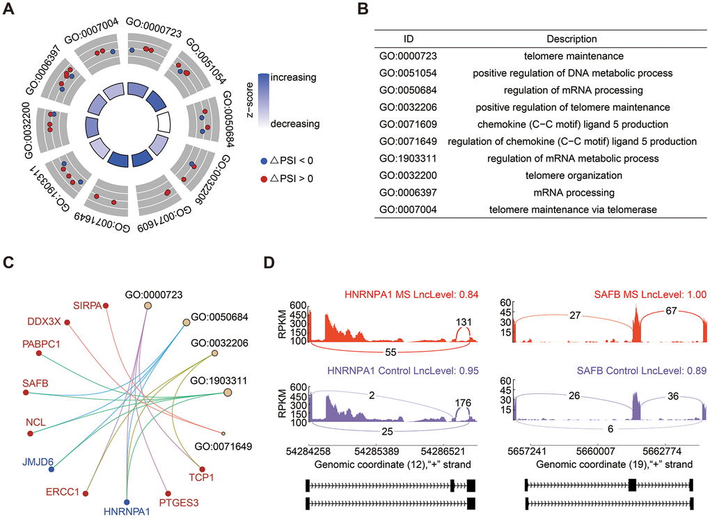 SE events emerged as the most prevalent alternative splicing events, constituting 36.36% of the total (Figure 1B). GO enrichment analysis of genes associated with significant SE events revealed enrichment in processes such as telomere maintenance and organization, regulation of mRNA processing, and metabolic processes (Figure 2A, 2B). Noteworthy genes implicated in these processes included Heterogeneous Nuclear Ribonucleoprotein A1 (HNRNPA1) and Scaffold Attachment Factor B (SAFB) (Figure 2C). The PSI value signifies whether an exon is included in the transcript quantification, essentially reflecting the exon length. In Figure 2D, it is evident that HNRNPA1 exhibited fewer exons, while SAFB displayed a tendency to have more exons in the MS group.