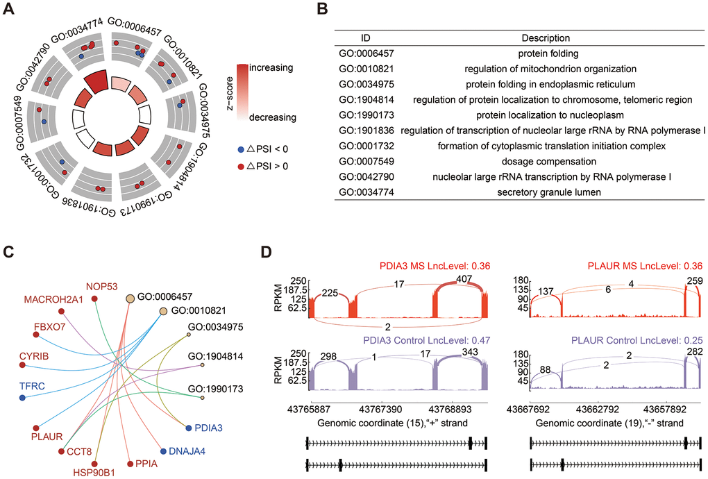 Mutually exclusive splicing represents a rare form of alternative splicing events, giving rise to alternative isoforms by selectively retaining only one exon from a cluster of neighboring internal exons. In our study, MXE exhibited the second most substantial changes in AS events, accounting for 32.58% (Figure 1B). GO analysis revealed significant enrichment in processes related to protein folding and mitochondrion organization (Figure 3A, 3B). Notable genes implicated in these processes included Protein Disulfide Isomerase Family A Member 3 (PDIA3), which exhibited a decreased PSI value, and Plasminogen Activator and Urokinase Receptor (PLAUR), which displayed an increased PSI (Figure 3C). Sashimi plots illustrated that PDIA3 tended to have shorter transcripts, whereas PLAUR exhibited longer transcripts in the MS group (Figure 3D).