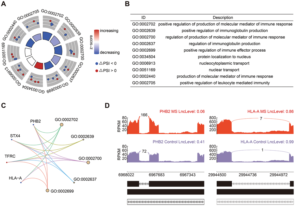 A total of 25 significant RI events were identified, constituting 18.94% of all AS events. GO analysis of genes associated with RI events predominantly enriched in immune response and immunoglobulin production (Figure 4A, 4B), including genes of PHB2 (Prohibitin 2) and HLA-A (Major Histocompatibility Complex, Class I, A) (Figure 4C). The PSI value in there represents the inclusion level of retained intron. Consequently, both HLA-A and PHB2 exhibited shorter introns in the MS group (Figure 4D).
