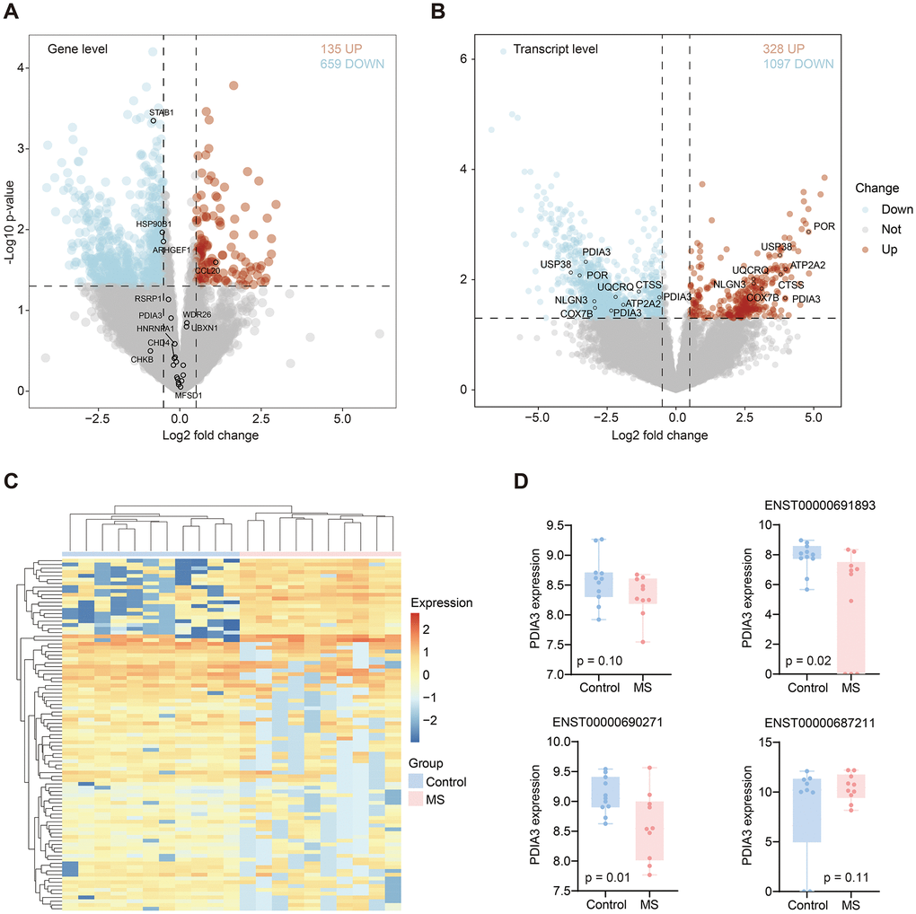 Transcript expression alterations did not consistently correlate with gene expression changes. Here, we investigated both differential gene and transcript expression levels. At the gene level, we identified 135 upregulated and 659 downregulated genes in the MS group compared with the control group (Figure 5A). Only four genes with significant AS events exhibited significant differences at the gene level. At the transcript level, we observed 328 upregulated and 1097 downregulated transcripts (Figure 5B). Heatmap illustrated the significant transcript expression differences between groups (Figure 5C). Among these transcripts, six genes with RI events were identified (Table 2). Several genes exhibited distinct transcript variations (ARHGEF1, CHD4, FCGRT, HSP90B1, PDIA3, STAB1, STXBP2). Notably, PDIA3 displayed contrasting expression changes across different transcripts; specifically, ENST00000691893 and ENST00000690271 presented lower expression levels, while ENST00000687211 exhibited a higher expression level in the MS group (Figure 5D).