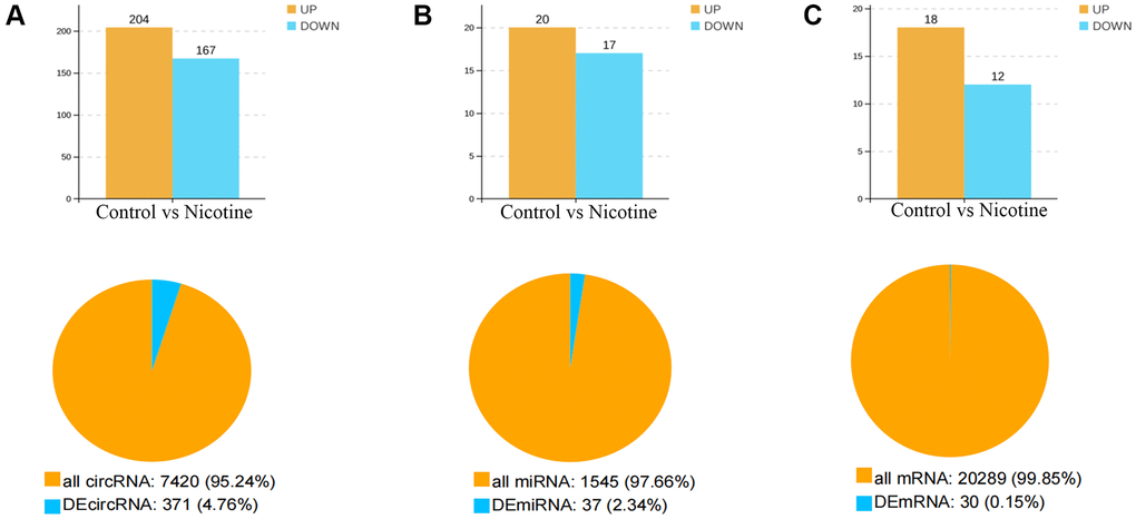 To date, there has been a lack of comprehensive investigations into the expression patterns of circRNAs that are differentially expressed between nicotine-induced apoptotic cells and their nonapoptotic counterparts. Thus, the present study aimed to fill this knowledge gap by systematically analysing circRNA expression in cells undergoing nicotine-induced apoptosis using advanced sequencing technology. When compared with the circBase database, most of the identified circRNAs were found to be previously unreported. According to our predetermined selection criteria (|FC|>2, P < 0.05), we identified a total of 371 DEcircRNAs, 204 of which exhibited increased expression and 167 of which exhibited decreased expression. Additionally, we assessed differential mRNA expression in nicotine-treated cells using paired comparisons between control and nicotine-treated cells and identified 30 DEmRNAs, 18 of which were upregulated and 12 of which were downregulated. Interestingly, a significant proportion of DEcircRNAs (55%) and DEmRNAs (60%) exhibited an upregulated pattern, indicating a consistent expression trend between circRNAs and mRNAs.