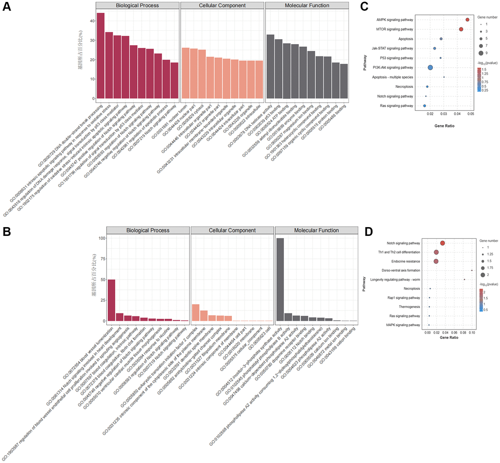 Figure 3A, 3C present the enrichment analysis results for the GO and KEGG pathways associated with the parent genes of the DEcircRNAs. Annotation analysis revealed that the parent genes of DEcircRNAs are predominantly located in the cytoplasm and are involved in significantly enriched biological processes related to apoptosis, such as DNA double-strand break processing and the regulation of oxidative stress. KEGG pathway enrichment analysis revealed that the parent genes of DEcircRNAs are primarily enriched in various apoptosis-related signalling pathways, including the Notch signalling pathway, the AMPK signalling pathway, and the mTOR signalling pathway.