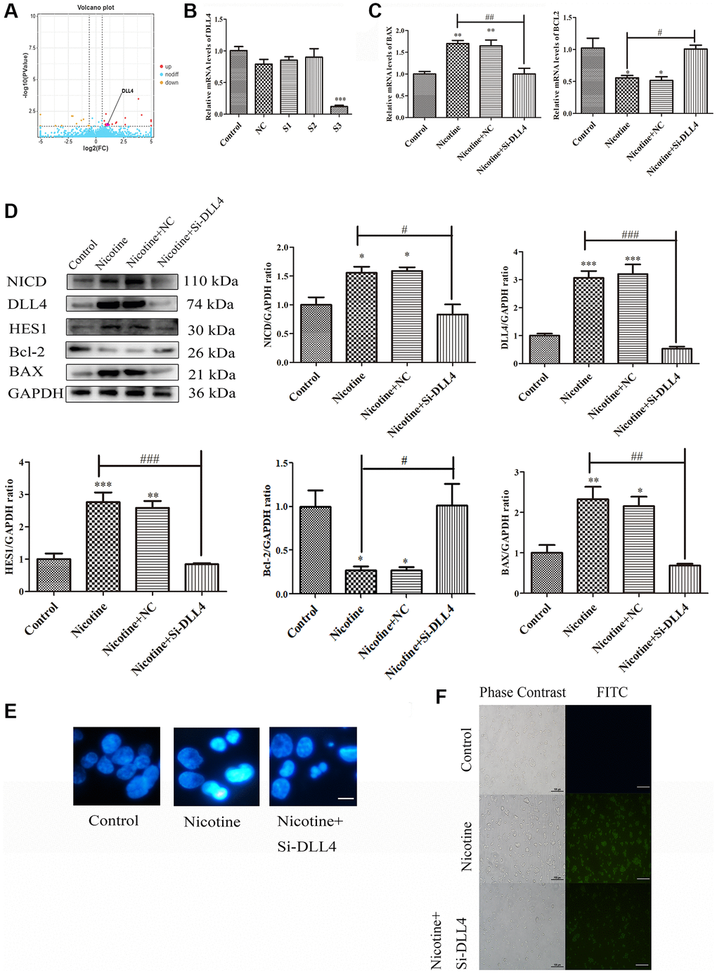 The DLL4/Notch signalling pathway is a crucial signal transduction system that regulates cellular processes such as proliferation, differentiation, apoptosis, invasion and metastasis. Abnormal regulation of this pathway contributes significantly to the development of various CVDs [20]. Volcano plots showed elevated DLL4 expression in THP-1 macrophages treated with nicotine (Figure 5A). To explore the relationship between apoptosis and the DLL4/Notch signalling pathway, we knocked down DLL4 using siRNA and selected the S3 interference fragment (P < 0.001) (Figure 5B). Knocking down DLL4 reversed nicotine-induced macrophage apoptosis while reducing the expression of the proapoptotic gene BAX (P < 0.01) and increasing the expression of the antiapoptotic gene BCL2 (P < 0.05) (Figure 5C). The ligand DLL4 of the Notch signalling pathway is critical for regulating the germination and branching morphology of blood vessels. WB analysis was used to determine the expression levels of critical proteins in the Notch signalling pathway, including DLL4, NICD, and HES1, which were significantly inhibited after DLL4 interference (P < 0.05). This indicates that interference with DLL4 inhibits nicotine-induced Notch signalling pathway activation (Figure 5D). The Hoechst staining results showed that nicotine-treated THP-1 macrophages exhibited characteristic concentrated bright nuclei of apoptotic cells, which significantly disappeared after DLL4 interference (Figure 5E). The Hoechst staining results again emphasized the inhibitory effect of DLL4 interference on nicotine-induced apoptosis. TUNEL staining further confirmed these findings, showing that nicotine treatment increased the number of apoptotic macrophages. At the same time, DLL4 interference significantly reduced the number of apoptotic cells among macrophages treated with nicotine (Figure 5F). This indicates that DLL4 is a crucial gene in nicotine-induced macrophage apoptosis. These results prove that nicotine activates macrophage apoptosis through the DLL4/Notch signalling pathway.