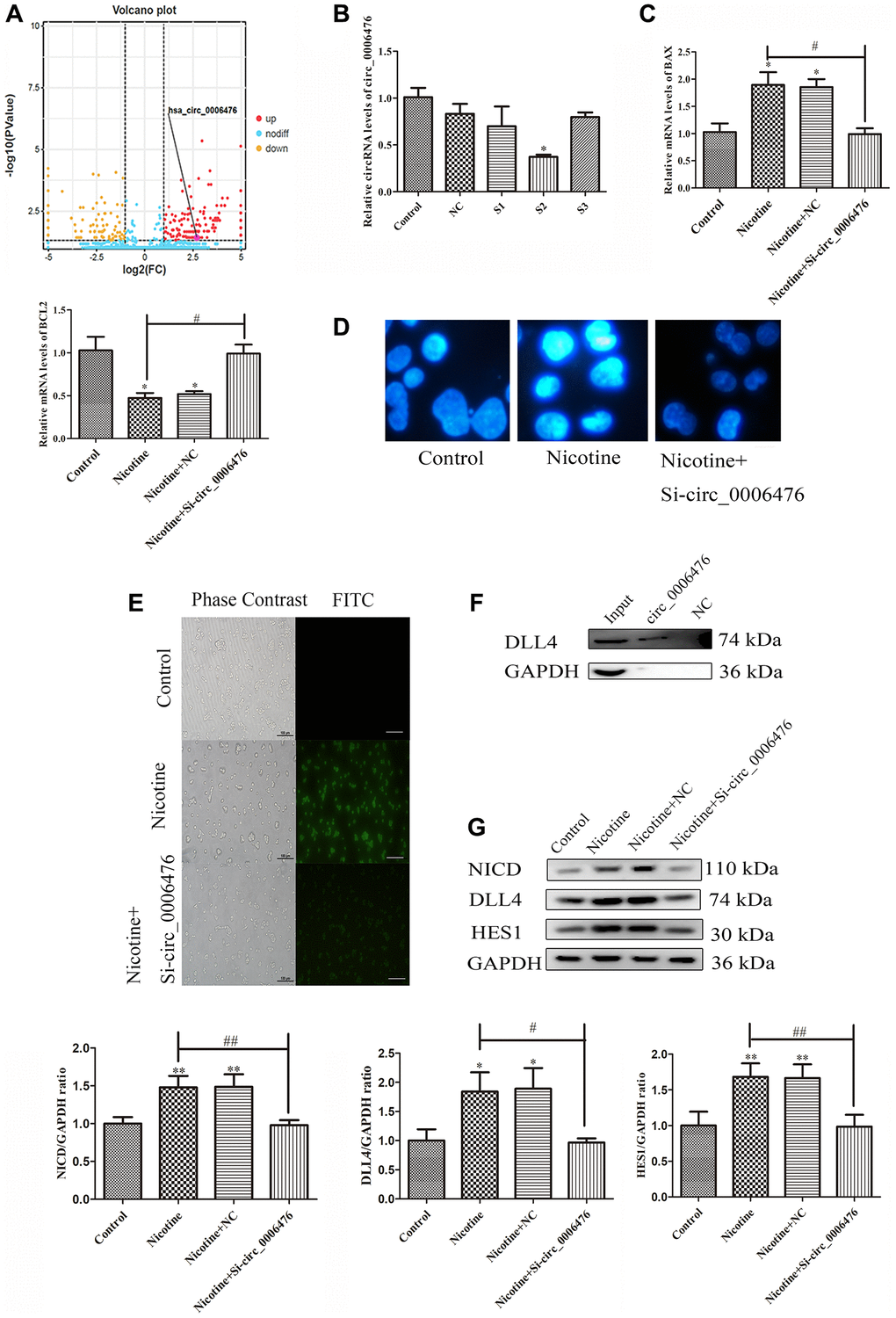 Previous studies have confirmed the significant regulatory role of circRNAs in apoptosis. Within the ceRNA network targeting DLL4, which includes three circRNAs, we focused on hsa_circ_0006476. Volcano plots revealed elevated expression of circ_0006476 in nicotine-treated THP-1 macrophages (Figure 6A). Subsequently, we used qPCR to screen for the optimal interfering fragment of circ_0006476, selected the S2 fragment with the best interfering effect (P < 0.05) (Figure 6B), and evaluated the expression of apoptosis-related genes after circ_0006476 interference. Compared with that in nicotine-treated cells, the expression of the proapoptotic gene BAX in nicotine-treated macrophages was significantly inhibited (P < 0.05) after circ_0006476 interference; however, the antiapoptotic gene BCL2 was significantly activated (P < 0.05) in nicotine-treated macrophages after circ_0006476 interference (Figure 6C). Similarly, the results of Hoechst (bright blue represents the apoptotic cell nucleus) and TUNEL staining (green fluorescence represents apoptotic cells) further demonstrated that inhibiting circ_0006476 expression effectively reversed nicotine-induced apoptosis (Figure 6D–6E). Then, we performed RNA pull-down analysis using the circ_0006476 probe and found that compared with the negative control, DLL4 strongly bound to circ_0006476. This indicates that circ_0006476 is involved in the regulation of DLL4 expression (Figure 6F). Finally, we confirmed whether circ_0006476 is involved in the Notch signalling pathway in cell apoptosis. Therefore, we detected the expression levels of Notch signalling pathway-related proteins after circ_0006476 interference. The WB results showed that after interfering with circ_0006476, the expression of the Notch signalling pathway proteins NICD, DLL4, and HES1 was significantly reduced (Figure 6G). These findings conclusively establish the involvement of circ_0006476 in nicotine-induced THP-1 macrophage apoptosis.