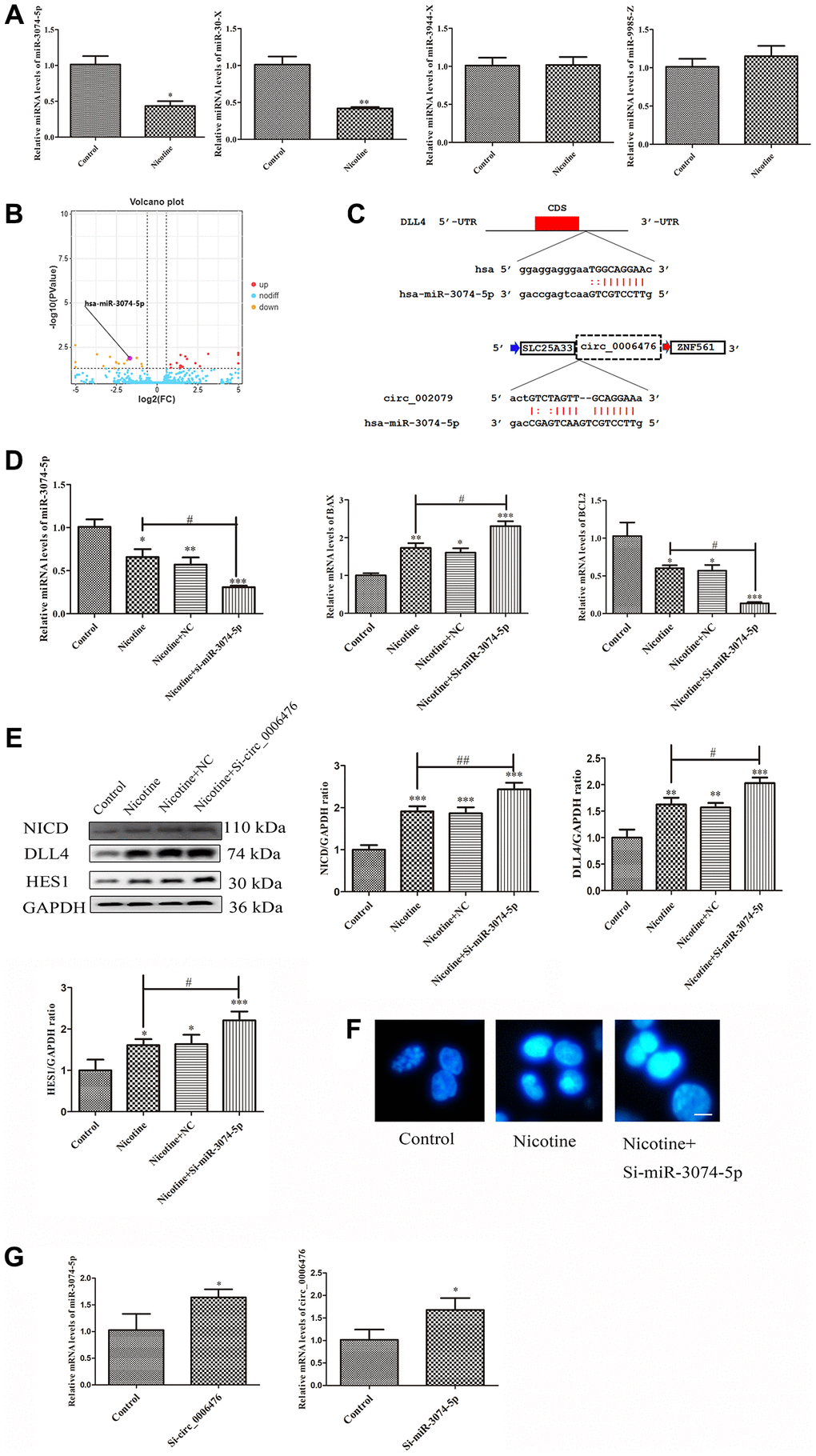 As circRNAs are considered to function primarily competitively by sequestering functional miRNAs and influencing gene expression, we investigated the potential regulatory effect of miRNAs associated with circ_0006476 on DLL4 expression. Our ceRNA network analysis revealed that circ_0006476 harbors binding sites for miR-3074-5p, miR-30x, miR-3944-x and miR-9985-z, among which miR-3074-5p is a known miRNA. To explore the role of these miRNAs in nicotine-induced apoptosis, we conducted qPCR to assess their expression after nicotine treatment, which revealed a significant upregulation of miR-3074-5p (Figure 7A). Volcano plots further confirmed the elevated expression of miR-3074-5p in THP-1 macrophages exposed to nicotine (Figure 7B). To further confirm whether miR-3074-5p is involved in the regulation of DLL4 by circ_0006476, we used miRanda and TargetScan for target gene prediction. The miRNA target gene prediction results were the intersection of the target gene prediction results obtained by the two methods (Figure 7C). This indicates that miR-3074-5p is likely involved in the regulation of DLL4 by circ_0006476 in nicotine-induced macrophages. Further validation is needed to determine whether miR-3074-5p is involved in the regulation of DLL4 by circ_0006476 in nicotine-induced macrophages. Subsequently, after interfering with miR-3074-5p expression, the expression of apoptotic genes was detected using qPCR. Compared with nicotine treatment, miR-3074-5p interference significantly increased the expression of the proapoptotic gene BAX in nicotine-treated macrophages (P < 0.05). After miR-3074-5p interference, the expression of the antiapoptotic gene BCL2 in nicotine-treated macrophages was significantly reduced (P < 0.05) (Figure 7D). We detected apoptosis and the expression of Notch signalling pathway-related proteins after interfering with miR-3074-5p and determined the impact of miR-3074-5p on the Notch signalling pathway. The WB results revealed that inhibition of miR-3074-5p expression activated the Notch signalling pathway and upregulated apoptosis (Figure 7E). These findings are consistent with the results from Hoechst (bright blue represents the apoptotic cell nucleus) (Figure 7F), collectively supporting the role of circ_0006476 as a miR-3074-5p sponge, thereby regulating DLL4 expression and apoptosis in THP-1 macrophages. The above results indicate that miR-3074-5p may be involved in the regulation of DLL4 by circ_0006476 in nicotine-induced macrophages, but the manner in which it participates is not yet clear. Then, we detected changes in the gene expression of miR-3074-5p in nicotine-treated macrophages after interference with circ_0006476. After interference with miR-3074-5p, changes in the gene expression of circ_0006476 were detected. The qPCR results revealed a sponge effect between the two, manifested as a significant increase in the gene expression of miR-3074-5p after interference with circ_0006476 (P < 0.05) and a significant increase in the gene expression of circ_0006476 after interference with miR-3074-5p (P < 0.05) (Figure 7G). All the above results collectively confirmed that circ_0006476-miR-3074-5p is involved in the activation of DLL4 and apoptosis in nicotine-induced macrophages through sponge adsorption.