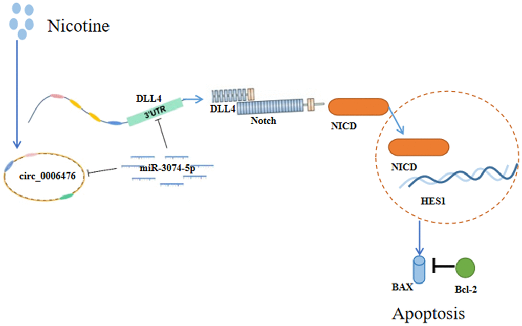 Our experimental findings collectively support the notion that 1 μM nicotine orchestrates circ_0006476-miR-3074-5p-DLL4 interactions to activate the Notch signalling pathway, triggering apoptosis in THP-1 macrophages and thereby accelerating the onset and progression of CVD (Figure 8).