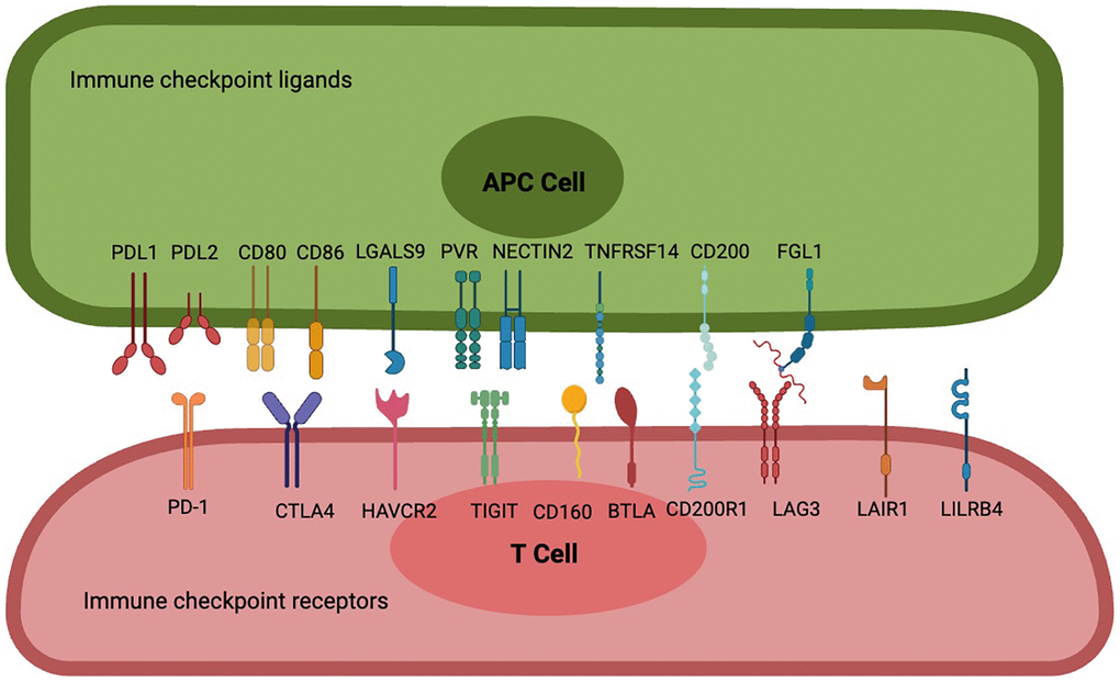 With the application of immune checkpoint blockers (ICBs), scientists have come to realize that the immune activation generated by targeting programmed cell death 1 (PD-1) combined with PDL1and PDL2 [6], or cytotoxic T-lymphocyte associated protein 4 (CTLA-4) combined with CD80 and CD86 [7], is not enough to control tumor progression. Based on the conclusions of current preclinical and clinical studies, we can preliminarily see that the most promising targeted immune checkpoint receptors and ligands include, but are not limited to: lymphocyte-activation gene-3 (LAG-3) combined with fibrinogen like 1 (FGL1) [8, 9], T-cell immunoglobulin and ITIM domain (TIGIT) combined with poliovirus receptors (PVR) and nectin cell adhesion molecule 2 (NECTIN2) [10–12], Hepatitis A virus cellular receptor 2 (HAVCR2) combined with lectin galactoside-binding soluble 9 (LGALS9) [12–15], CD200 receptor 1 (CD200R1) combined with CD200 [16–20], CD160 combined with TNF receptor superfamily member 14 (TNFRSF14) [21–24], B and T lymphocyte associated (BTLA) combined with TNFRSF14 [22, 23, 25, 26], Leukocyte associated immunoglobulin like receptor 1 (LAIR1) [27–30] mainly combined with collagen, and leukocyte immunoglobulin like receptor B4 (LILRB4) with a variety of ligands [31–33]. We will cover these immune checkpoint molecules and highlight their expression at different tumor, at different cellular levels. The mechanism of interaction between these immune checkpoints is clearly and schematically described (Figure 1).