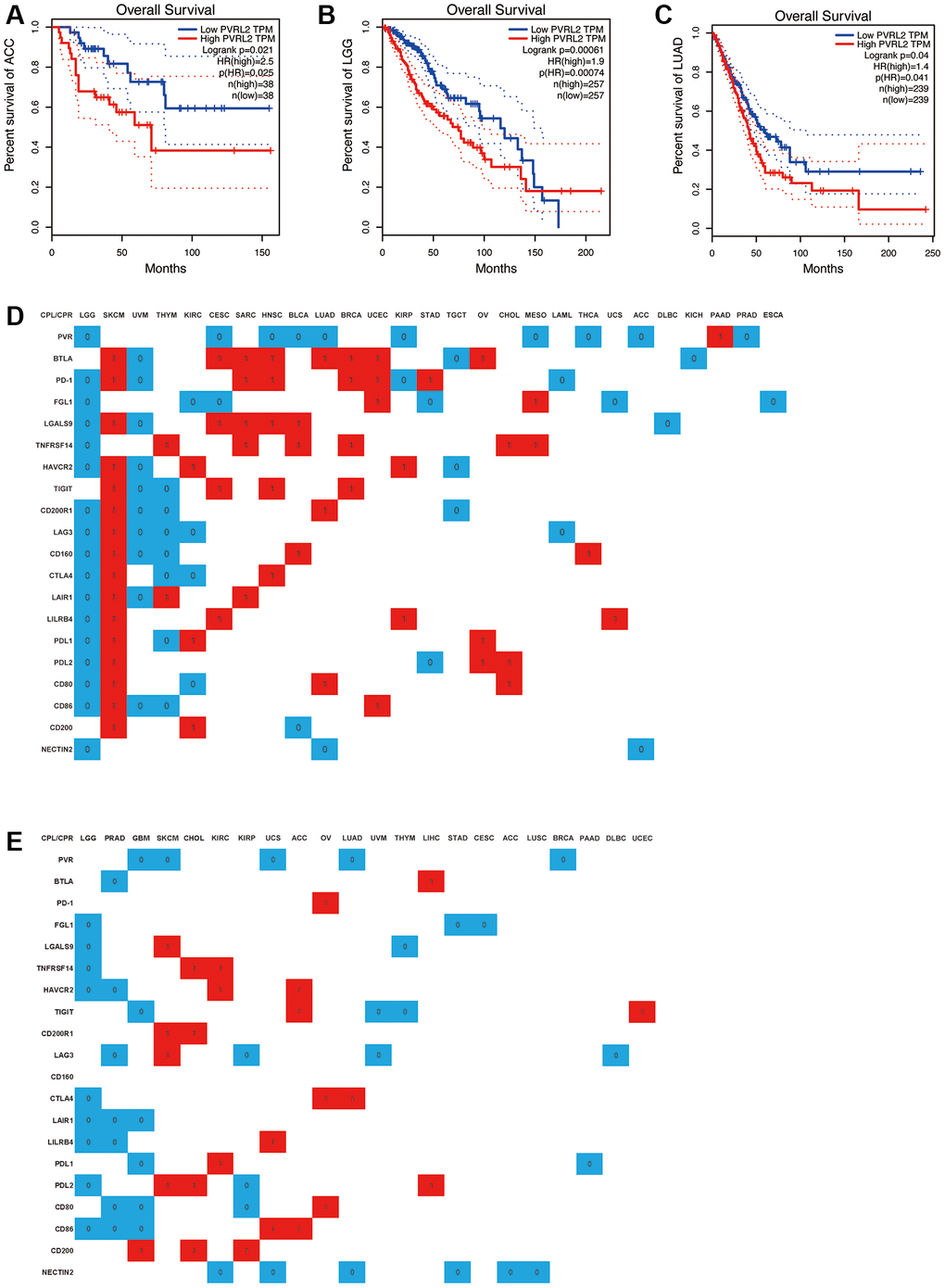 In summary, our investigation reveals associations between various immune checkpoint expressions and their correlation with pan-cancer as well as specific cellular components of the immune microenvironment. PVR and NECTIN2 expression serve as prognostic indicators in patients diagnosed with LGG, LUAD, ACC, and UCS. Across most tumor types, there exists a robust correlation between PVR and NECTIN2 expression and infiltration of epithelial cells. However, in LUAD and UCS, epithelial cells do not emerge as the primary cellular component, suggesting that PVR and NECTIN2 might hold greater significance in LGG and ACC. Notably, elevated levels of PVR and NECTIN2 are predictive of poorer prognosis and could potentially influence the progression of LGG and ACC through immune modulation and disruption of normal physiological functions. Overall, our findings propose PVR and NECTIN2 as promising biomarkers for prognostic assessment and evaluation of immune infiltration across various tumor types, particularly in LGG and ACC. Nevertheless, further experimental validation is essential to corroborate these findings.