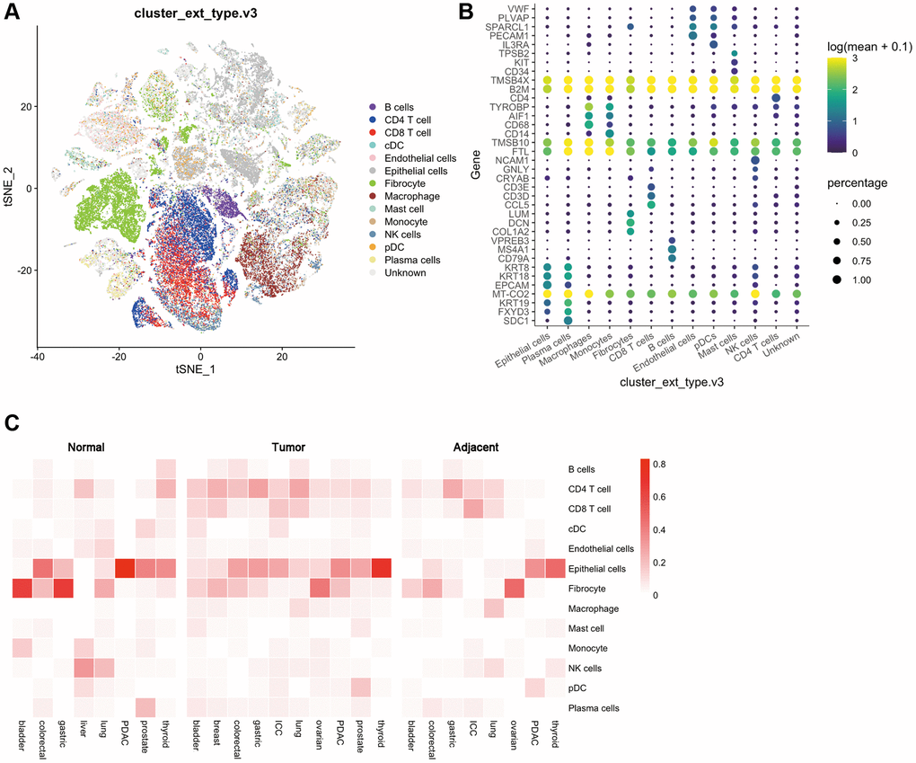 First, the GEO database was used to analyze the expression of cell subsets in multiple cancer species. The results showed that 13 types of cells, including B cells, Plasma cells, CD4+ T cells, CD8+ T cells, classical dendritic cells cDCs), plasmacytoid dendritic cells pDCs), endothelial cells, epithelial cells, fibrocyte, macrophage, mast cells, monocyte, NK cells, could be detected in all the multi-cancer species evaluated Figure 2A, 2B).