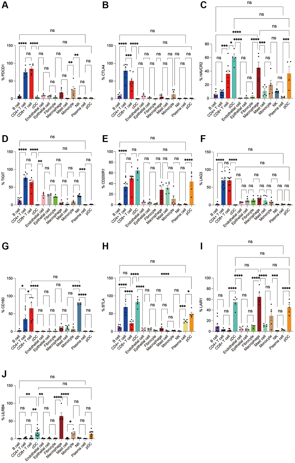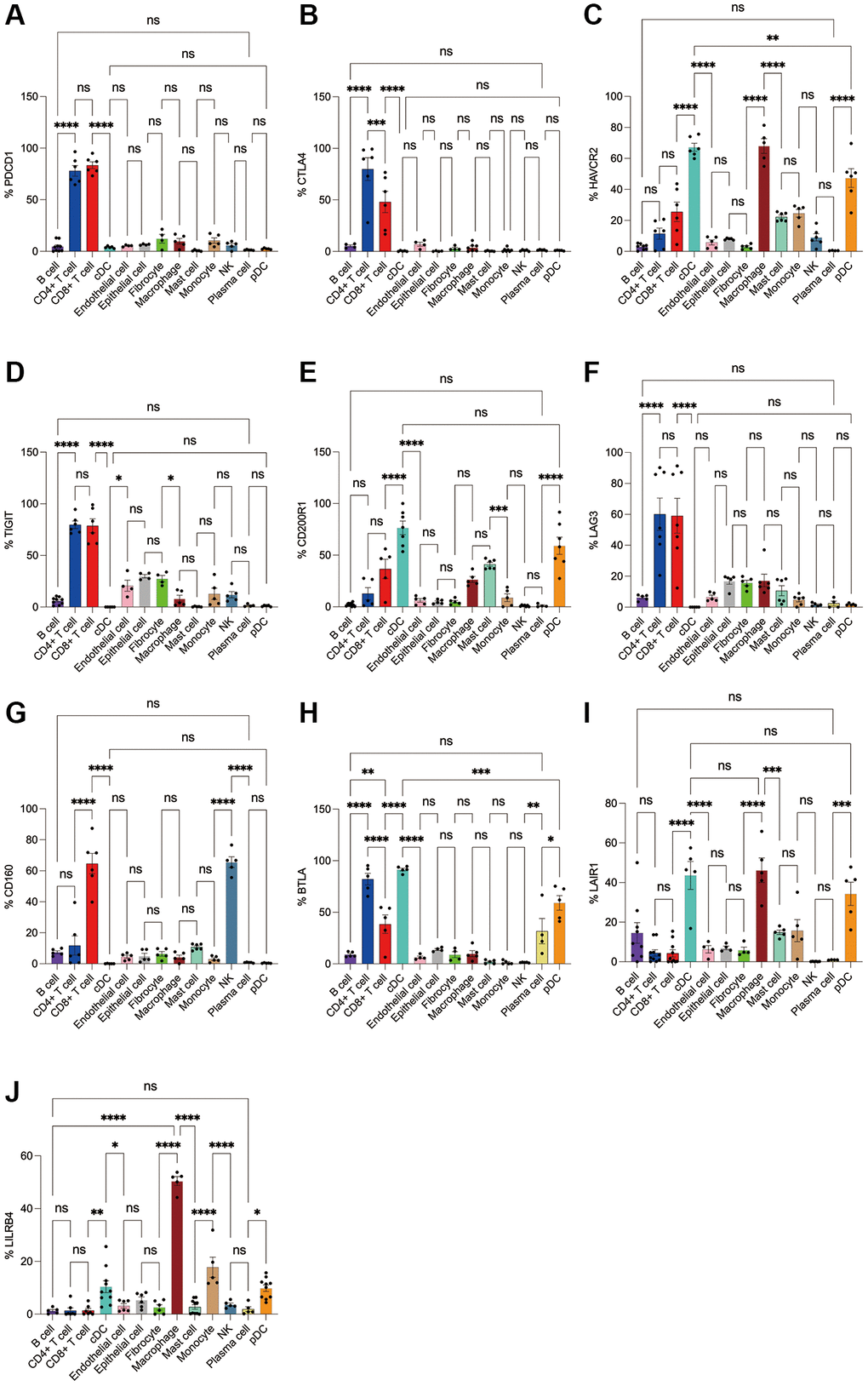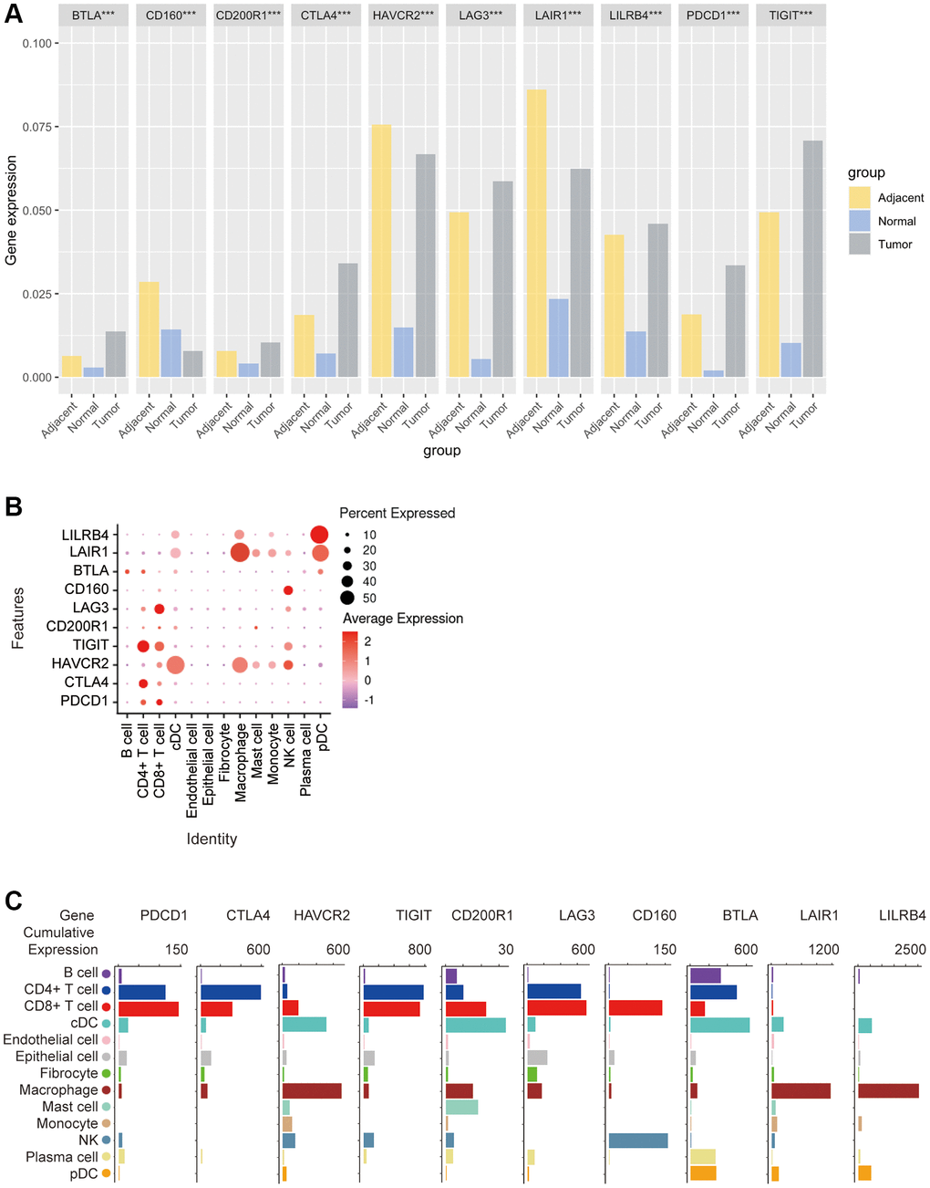 For 20 markers (PDCD1, CTLA4, HAVCR2, TIGIT, CD200R1, LAG3, CD160, BTLA, LAIR1, LILRB4, CD274, PDCD1LG2, CD80, CD86, LGALS9, PVR, NECTIN2, FGL1, CD200, TNFRSF14), the proportion of positive cells was calculated separately, and chi square test was used for inter group comparison between tumor, normal, and adjacent tissues. The barplots were visualized by the ggplot function in ggplot2 package (Version 3.3.5).