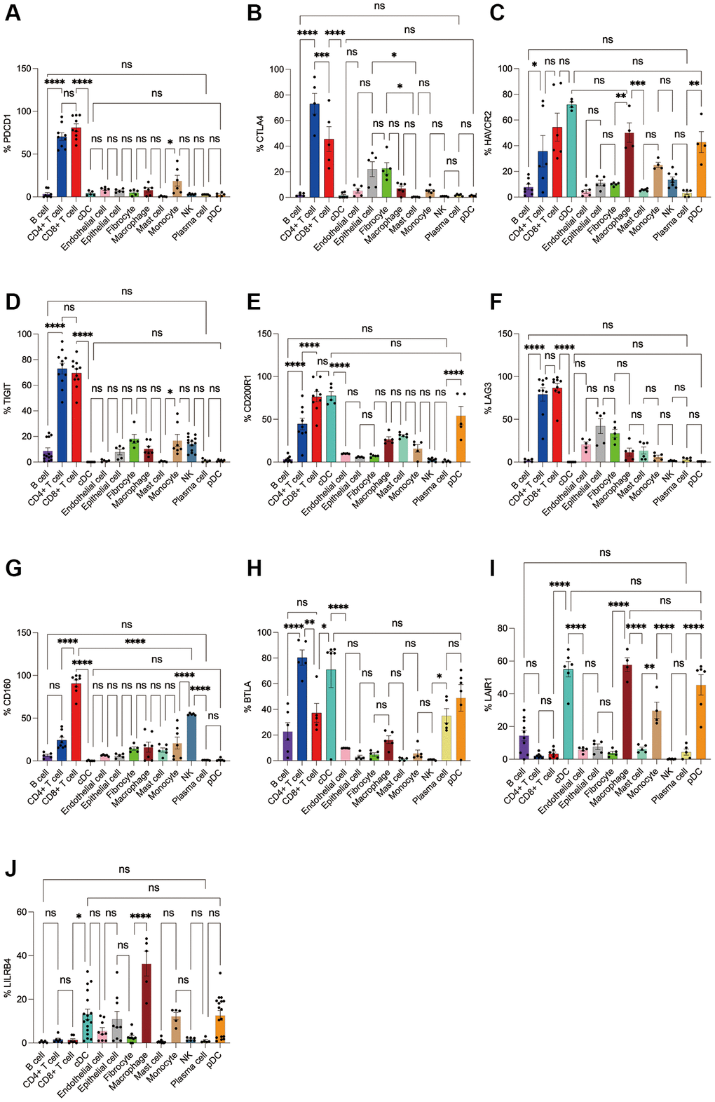 Subsequently, we applied flow cytometry to validate in fresh samples of human breast cancer, colorectal cancer, and lung cancer. We can see that PD-1 is most expressed in CD4+ T cells and CD8+ T cells among all three tumors, and there is no difference between the two groups, followed by monocytes, although no difference is observed in breast cancer (Figures 4A, 5A, 6A). For CTLA4, CD4+ T cells were the most expressed, significantly higher than the second CD8+ T cells, and the expression of the rest of the cells was low, but epithelial cells and fibroblasts in lung cancer also expressed CTLA4 higher, which was not observed in breast cancer and colorectal cancer (Figures 4B, 5B, 6B). In addition, pDCs and CD8+ T cells were also found to express HAVCR2 in high expression and CD4+ T cells in lung cancer, while CD4+ T cells in breast cancer and colorectal cancer expressed HAVCR2 significantly lower than CD8+ T cells (Figures 4C, 5C, 6C). TIGIT was highly expressed on CD4+ T cells and CD8+ T cells in all three tumors, moderately expressed on NK cells in colorectal cancer, and moderately expressed in monocytes in lung cancer (Figures 4D, 5D, 6D). CD200R1 had the highest expression on cDCs, followed by CD8+ T cells, and moderate expression on CD4+ T cells, macrophages, and mast cells, which was consistent with bioinformatics analysis, except that pDC cells were also highly CD200R1 expressed by flow cytometry (Figures 4E, 5E, 6E). Similarly, flow cytometry results showed that LAG3 was highly expressed in CD4+ T cells and CD8+ T cells, with the remaining cell subsets being low or not expressed (Figures 4F, 5F, 6F). The results of CD160 were similar to the results of Bioxin, with high expression on CD8+ T cells and NK cells, in addition to CD4+ T cells in colorectal cancer, which was not observed in breast and lung cancer (Figures 4G, 5G, 6G). BTLA was found to be significantly increased in CD4+ T cells, cDCs, plasma cells, and pDCs. In contrast to bioinformatics analysis, flow cytometry analysis showed that CD8+ T cells expressed BTLA higher than B cells in breast cancer, and this trend was observed in colorectal cancer and lung cancer but no significant difference was observed (Figures 4H, 5H, 6H). In addition to the high expression of LAIR1 in macrophages, flow cytometry also found that cDCs and pDCs were also highly expressed in cDC and pDC cells in three tumors, and monocytes from colorectal and lung cancers were also found to express LAIR1 (Figures 4I, 5I, 6I). LILRB4 was most expressed in macrophages and moderately expressed in cDCs, and monocytes and pDCs were also found to express LILRB4 higher than most cell subsets (Figures 4J, 5J, 6J).
