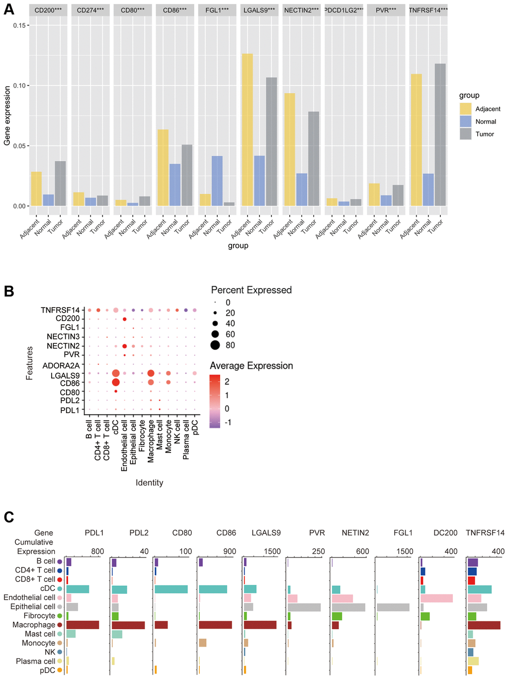 Next, we used the GEO database to analyze the expression of these 10 ICLs in tumor, adjacent and normal tissues. The results showed that CD200, CD80 and TNFRSF14 were the highest in tumor tissues, CD274 (PDL1), CD86, LGALS9, NECTIN2, PDL2, PVR were lower than those in adjacent tissues but higher than those in normal tissues, and FGL1 was the lowest in tumor tissues. It is important to note that these ligands are all least expressed in normal tissues, with the exception of FGL1, which is indeed the highest expressed in normal tissues. (Kruskal-Wallis test, p < 0.001) (Figure 7A).