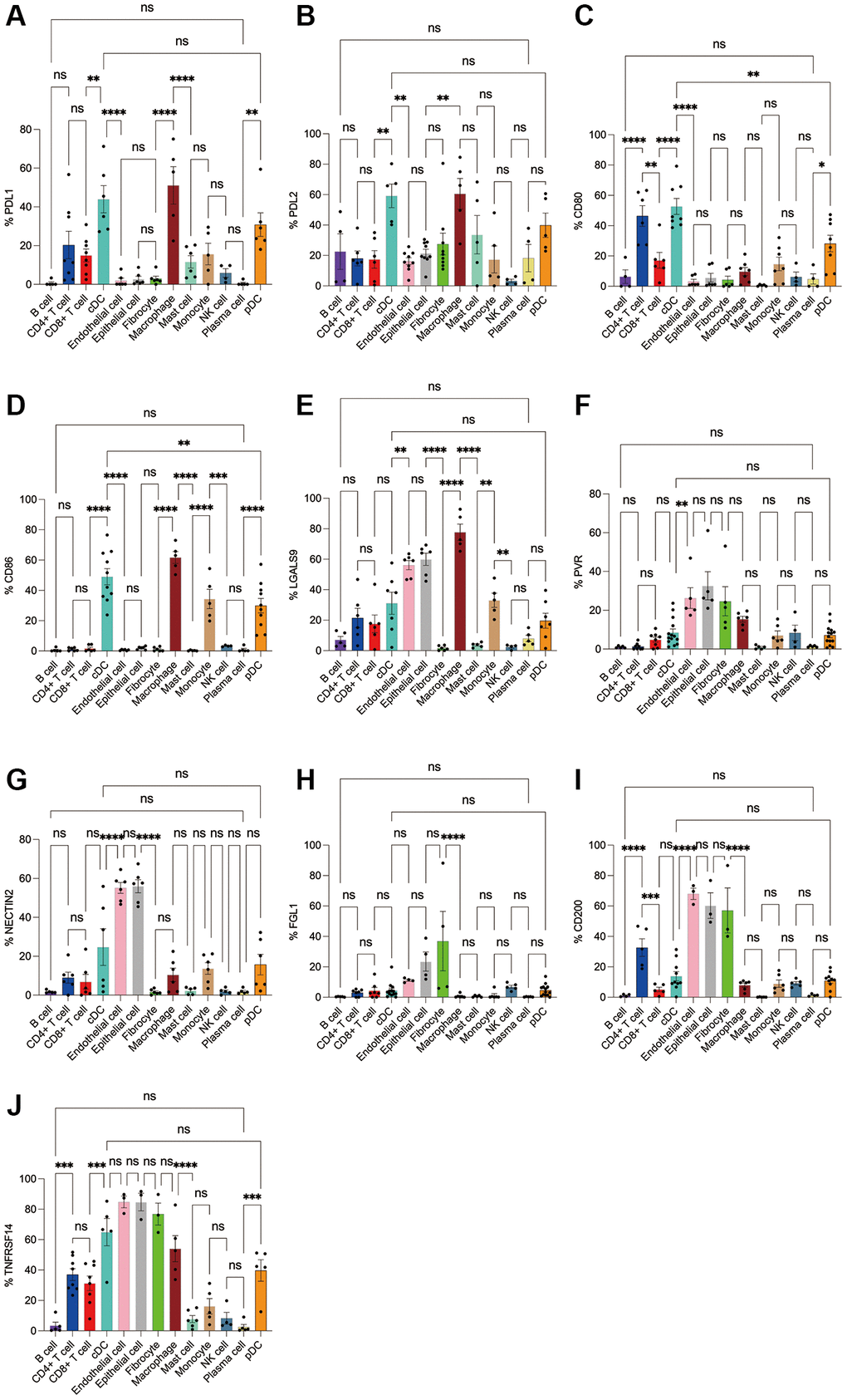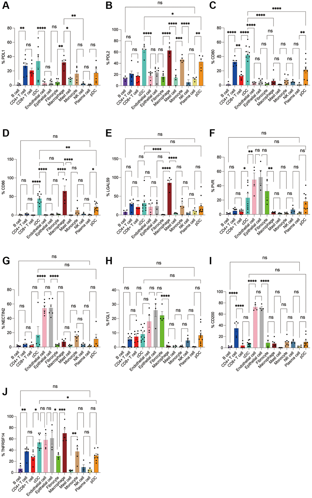 Subsequently, we applied flow cytometry to validate in fresh samples of human breast cancer, colorectal cancer, and lung cancer. Among the three tumors, PDL1 and PDL2 were the highest expressed in macrophages, followed by cDCs, and mast cells were expressed in low amounts. Unlike in the bioinformatics results, CD4+ T cells, CD8+ T cells, monocytes, and pDC cells were found to express PDL1 and PDL2 in moderate amounts by flow cytometry (Figures 8A, 8B, 9A, 9B, 10A, 10B). For CD80, in addition to the high expression of cDCs and the moderate expression of macrophages, high expression of CD4+ T cells, moderate expression of CD8+ T cells and pDCs were also found to be significantly higher than those of other cell subsets (Figures 8C, 9C, 10C). The results of CD86 showed high expression on cDCs and macrophages, which were consistent with the results of bioinformatics analysis. In addition, pDCs were also found to moderately express CD86, and monocytes in colorectal cancer also moderately expressed CD86 (Figures 8D, 9D, 10D). The expression of LGALS9 cell subsets in the three tumors was quite different, with macrophages being the highest in breast cancer and lower in the rest of the cell subsets, and macrophages, epithelial cells, endothelial cells, and monocytes were all expressed more in colorectal cancer, while macrophages were only moderately expressed in lung cancer, and epithelial cells, endothelial cells, cDCs, CD8+ T cells, CD4+ T cells, and pDCs were all expressed higher (Figures 8E, 9E, 10E). PVR showed high expression on endothelial cells, epithelial cells, fibroblasts, and cDCs in all three tumors, but only in breast cancer showed significant differences from other cell subsets, and unlike the bioinformatics results, pDCs also expressed moderate amounts of PVR (Figures 8F, 9F, 10F). The results of the NECTIN2 were also similar to the results of Bioxin, with the highest expression in epithelial cells and endothelial cells, and there was no difference between the two cells (Figures 8G, 9G, 10G). FGL1 was found to be most expressed in epithelial cells of breast and colorectal cancer, followed by fibroblasts, and there was a significant difference in lung cancer (Figures 8H, 10H). In addition to this, we also found differences from bioinformatics analysis, which found that FGL1 was highly expressed in endothelial cells, cDCs, CD8+ T cells, CD4+ T cells, and pDCs in breast and lung cancers, while only fibroblasts and epithelial cells were moderately expressed in colorectal cells (Figures 8H, 9H, 10H). In addition to validating the high expression of CD200 in endothelial cells in bioletters, flow cytometry also found that epithelial cells and CD4+ T cells also expressed CD200 in three tumors, and fibroblasts in colorectal cancer were highly expressed CD200 (Figures 8I, 9I, 10I). The TNFRSF14 of breast and lung cancer is most expressed in macrophages, while in colorectal cancer the highest expression is in endothelial, epithelial, and fibroblasts, and macrophages are only moderately expressed (Figures 8J, 9J, 10J). CD4+ T cells, CD8+ T cells, monocytes, and pDCs were moderately expressed in the three tumors, which was TNFRSF14 higher than the proportion shown in the bioinformatics results. (Figures 8J, 9J, 10J).