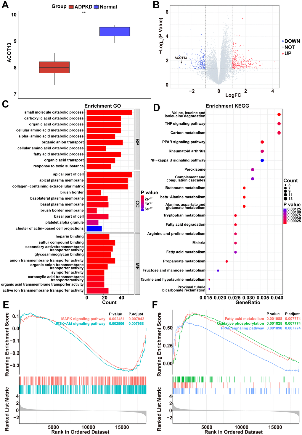 To analyze the possible pathways associated with ACOT13 in ADPKD, DEGs were screened between H- and L-ACOT13 groups. Compared to the L-ACOT13 group, a total of 632 DEGs were found in the H-ACOT13 group (Figure 1B). Next, different functional analyses were performed on these 632 DEGs. GO results showed that these genes were appeared in 1398 GO terms (e.g. small molecule catabolic process, apical part of cell and heparin binding) (Figure 1C and Supplementary Table 1). KEGG results showed that 58 KEGG pathways (e.g. PPAR signaling pathway, NF-kappa B signaling pathway, FoxO signaling pathway) were related to these genes (Figure 1D and Supplementary Table 1). Moreover, GSEA results showed that compared to the L-ACOT13 group, 177 pathways including PI3K-Akt signaling pathway and MAPK signaling pathway (two mitochondrial dependent apoptosis pathways) [20, 21], and PPAR signaling pathway (a pathway that could regulate mitochondrial function) [22], and fatty acid metabolism and oxidative phosphorylation (two processes that occurs in mitochondria) [23], were more enriched in the H-ACOT13 group (Figure 1E, 1F and Supplementary Table 2). The data in Figure 1E, 1F showed that compared to the L-ACOT13 group, PI3K-Akt and MAPK signaling pathways were inactivated in the H-ACOT13 group, and PPAR signaling pathway, fatty acid metabolism and oxidative phosphorylation were activated in the H-ACOT13 group. These results showed that ACOT13 may play a role in regulating mitochondrial function in ADPKD.