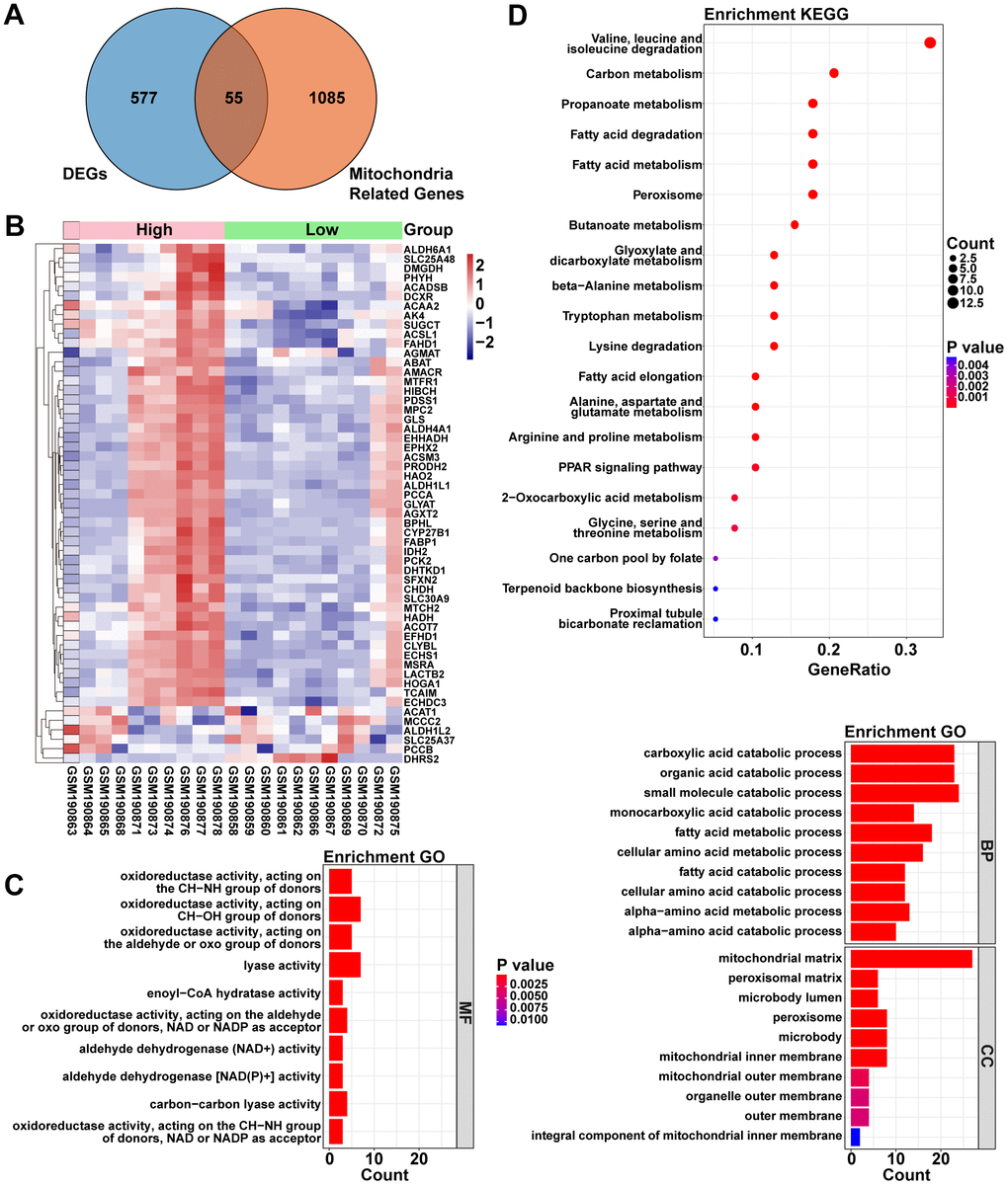 1140 Mito-RGs were acquired from the MitoCarta3.0 database (http://www.broadinstitute.org/mitocarta). To explore the relationship between ACOT13 and Mito-RGs in ADPKD, the venn diagram was used to screen the overlapping mitochondria-related DEGs. As shown in Figure 2A, 2B, there were 55 mitochondria-related genes between H- and L-ACOT13 groups. GO and KEGG analyses were then performed on these 55 genes. GO results showed that these genes were appeared in 329 GO terms (e.g. carboxylic acid catabolic process, mitochondrial matrix, fatty acid oxidation and lipid oxidation) (Figure 2C and Supplementary Table 3). KEGG results showed that 25 KEGG pathways (e.g. Fatty acid metabolism and PPAR signaling pathway) were related to these genes (Figure 2D and Supplementary Table 3).