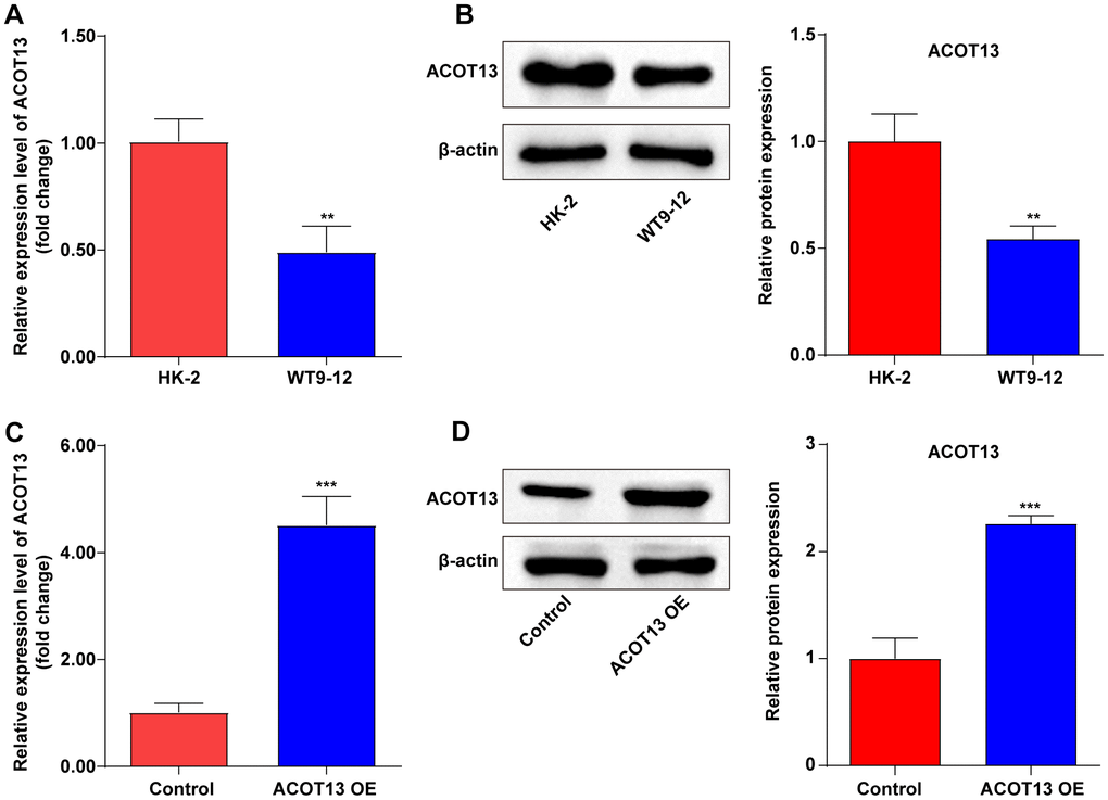 To explore the role of ACOT13 in ADPKD in vitro, ACOT13 level was evaluated in WT9-12 cells first. The data showed that the mRNA and protein level of ACOT13 was obviously reduced in WT9-12 cells compared to HK-2 cells (Figure 3A, 3B). Meanwhile, compared to the control group, the mRNA and protein level of ACOT13 was remarkably elevated in WT9-12 cells transfected with ACOT13 OE plasmids (Figure 3C, 3D).