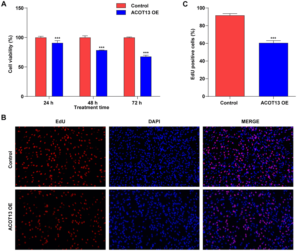 Next, the functional roles of ACOT13 in WT9-12 cells were then investigated by CCK-8 and EdU staining assays. ACOT13 overexpression induced about 9% growth inhibition in WT9-12 cells at 24 h, induced about 22% growth inhibition in WT9-12 cells at 48 h and induced about 32% growth inhibition in WT9-12 cells at 72 h (Figure 4A), suggesting that ACOT13 overexpression could decline WT9-12 cell viability. Additionally, ACOT13 overexpression obviously decreased the percentage of EdU positive cells (~61%) compared with control group (~92%), indicating that ACOT13 overexpression could suppress WT9-12 cell proliferation (Figure 4B, 4C). Collectively, ACOT13 overexpression was able to suppress WT9-12 cell viability and proliferation.